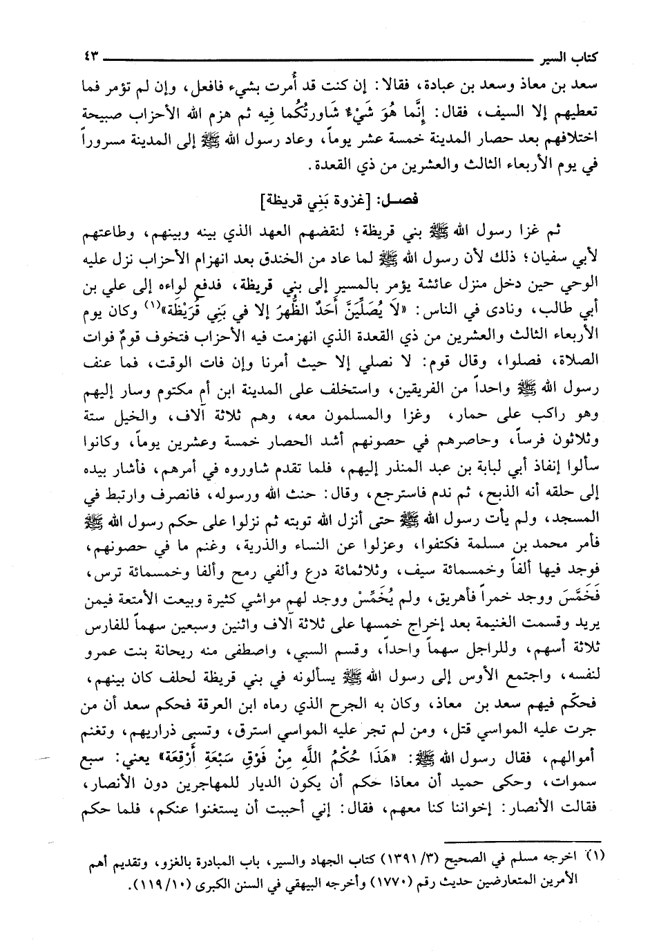 ثُمَّ غَزَا رَسُولُ اللَّهِ - صَلَّى اللَّهُ عَلَيْهِ وَسَلَّم َ - بَنِي قُرَيْظَةَ؛ لِنَقْضِهِمُ الْعَهْدَ الَّذِي بَيْنَهُ وَبَيْنَهُمْ، وَطَاعَتِهِمْ لِأَبِي سُفْيَانَ؛ ذَلِكَ لِأَنَّ رَسُولَ اللَّهِ - صَلَّى اللَّهُ عَلَيْهِ وَسَلَّم َ - لَمَّا عَادَ مِنَ الْخَنْدَقِ بَعْدَ انْهِزَامِ الْأَحْزَابِ نَزَلَ عَلَيْهِ الْوَحْيُ حِينَ دَخَلَ مَنْزِلَ عَائِشَةَ يُؤْمَرُ بِالْمَسِيرِ إِلَى بَنِي قُرَيْظَةَ، فَدَفَعَ لِوَاءَهُ إِلَى عَلِيِّ بْنِ أَبِي طَالِبٍ، وَنَادَى فِي النَّاسِ: " لَا يُصَلِّيَنَّ أَحَدٌ الظُّهْرَ إِلَّا فِي بَنِي قُرَيْظَةَ " وَكَانَ يَوْمَ الْأَرْبِعَاءِ الثَّالِثَ وَالْعِشْرِينَ مِنْ ذِي الْقَعْدَةِ الَّذِي انْهَزَمَتْ فِيهِ الْأَحْزَابُ فَتَخَوَّفَ قَوْمٌ فَوَاتَ الصَّلَاةِ، فَصَلَّوْا، وَقَالَ قَوْمٌ: لَا نُصَلِّي إِلَّا حَيْثُ أُمِرْنَا وَإِنْ فَاتَ الْوَقْتُ، فَمَا عَنَّفَ رَسُولُ اللَّهِ - صَلَّى اللَّهُ عَلَيْهِ وَسَلَّم َ - وَاحِدًا مِنَ الْفَرِيقَيْنِ، وَاسْتَخْلَفَ عَلَى الْمَدِينَةِ ابْنَ أُمِّ مَكْتُومٍ وَسَارَ إِلَيْهِمْ وَهُوَ رَاكِبٌ عَلَى حِمَارٍ، وَغَزَا وَالْمُسْلِمُونَ مَعَهُ، وَهُمْ ثَلَاثَةُ آلَافٍ، وَالْخَيْلُ سِتَّةٌ وَثَلَاثُونَ فَرَسًا، وَحَاصَرَهُمْ فِي حُصُونِهِمْ أَشَدَّ الْحِصَارِ خَمْسَةً وَعِشْرِينَ يَوْمًا، وَكَانُوا سَأَلُوا إِنْفَاذَ أَبِي لُبَابَةَ بْنِ عَبْدِ الْمُنْذِرِ إِلَيْهِمْ، فلما تقدم شاوروه فِي أَمْرِهِمْ، فَأَشَارَ بِيَدِهِ إِلَى حَلْقِهِ أَنَّهُ الذَّبْحُ، ثُمَّ نَدِمَ فَاسْتَرْجَعَ، وَقَالَ: حَنِثَ اللَّهَ وَرَسُولَهُ، فَانْصَرَفَ وَارْتَبَطَ فِي الْمَسْجِدِ، وَلَمْ يَأْتِ رسول الله - صَلَّى اللَّهُ عَلَيْهِ وَسَلَّم َ - حتى أنزل الله توبته ثُمَّ نَزَلُوا عَلَى حُكْمَ رَسُولِ اللَّهِ - صَلَّى اللَّهُ عَلَيْهِ وَسَلَّم َ - فَأَمَرَ مُحَمَّدَ بْنَ مَسْلَمَةَ فَكُتِّفُوا، وَعُزِلُوا عَنِ النِّسَاءِ وَالذُّرِّيَّةِ، وَغَنَمَ مَا فِي حُصُونِهِمْ فَوَجَدَ فِيهَا أَلْفًا وَخَمْسَمِائَةِ سَيْفٍ، وَثَلَاثَمِائَةِ دِرْعٍ وَأَلْفَيْ رُمْحٍ وَأَلْفًا وَخَمْسَمِائَةِ تُرْسٍ فَخَمَّسَ وَوَجَدَ خَمْرًا فَأُهْرِيقَ، وَلَمْ يُخَمّسْ وَوَجَدَ لَهُمْ مَوَاشِيَ كَثِيرَةً وَبِيعَتِ الْأَمْتِعَةُ فِيمَنْ يُرِيدُ وَقُسِّمَتِ الْغَنِيمَةُ بَعْدَ إِخْرَاجِ خُمُسِهَا عَلَى ثَلَاثَةِ آلَافٍ وَاثْنَيْنِ وَسَبْعِينَ سَهْمًا لِلْفَارِسِ ثَلَاثَةُ أَسْهُمٍ، وَلِلرَّاجِلِ سَهْمًا وَاحِدًا، وَقَسَمَ السَّبْيَ، وَاصْطَفَى مِنْهُ رَيْحَانَةَ بِنْتَ عَمْرٍو لِنَفْسِهِ، وَاجْتَمَعَ الْأَوْسُ إِلَى رَسُولِ اللَّهِ - صَلَّى اللَّهُ عَلَيْهِ وَسَلَّم َ - يَسْأَلُونَهُ فِي بَنِي قُرَيْظَةَ لِحِلْفٍ كَانَ بَيْنَهُمْ فَحَكَّمَ فِيهِمْ سَعْدَ بْنَ مُعَاذٍ، وَكَانَ بِهِ الْجُرْحُ الَّذِي رَمَاهُ ابْنُ الْعَرِقَةِ فَحَكَمَ سَعْدٌ أن مَنْ جَرَتْ عَلَيْهِ الْمَوَاسِي قُتِلَ، وَمَنْ لَمْ تجر عَلَيْهِ الْمَوَاسِي اسْتُرِقَّ، وَتُسْبَى ذَرَارِيُّهُمْ، وَتُغْنَمُ أَمْوَالُهُمْ، فَقَالَ رَسُولُ اللَّهِ - صَلَّى اللَّهُ عَلَيْهِ وَسَلَّم َ -: " هَذَا حُكْمُ اللَّهِ مِنْ فَوْقِ سَبْعَةِ أَرْقِعَةٍ " يعني: سبع سموات، وَحَكَى حُمَيْدٌ أَنَّ مُعَاذًا حَكَمَ أَنْ يَكُونَ الدِّيَارُ لِلْمُهَاجِرِينَ دُونَ الْأَنْصَارِ فَقَالَتِ الْأَنْصَارُ: إِخْوَانُنَا كُنَّا مَعَهُمْ، فَقَالَ: إِنِّي أَحْبَبْتُ أَنْ يَسْتَغْنَوْا عَنْكُمْ، فَلَمَّا حَكَمَ