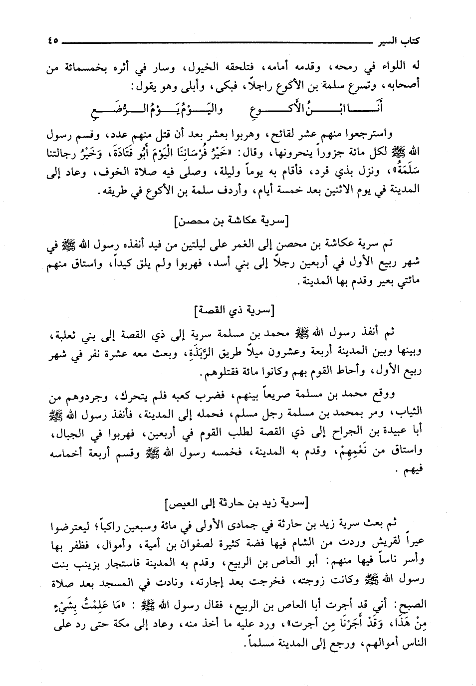 وَوَقَعَ مُحَمَّدُ بْنُ مَسْلَمَةَ صَرِيعًا بَيْنَهُمْ، فَضُرِبَ كَعْبُهُ فَلَمْ يَتَحَرَّكْ، وَجَرَّدُوهُمْ مِنَ الثِّيَابِ، وَمَرَّ بِمُحَمَّدِ بْنِ مَسْلَمَةَ رَجُلٌ مُسْلِمٌ، فَحَمَلَهُ إِلَى الْمَدِينَةِ، فَأَنْفَذَ رَسُولُ اللَّهِ - صَلَّى اللَّهُ عَلَيْهِ وَسَلَّم َ - أَبَا عُبَيْدَةَ بْنَ الْجَرَّاحِ إِلَى ذِي الْقَصَّةِ لِطَلَبِ الْقَوْمِ فِي أَرْبَعِينَ، فَهَرَبُوا فِي الْجِبَالِ وَاسْتَاقَ مِنْ نَعَمِهِمْ، وَقَدِمَ بِهِ الْمَدِينَةَ، فَخَمَّسَهُ رسول الله - صَلَّى اللَّهُ عَلَيْهِ وَسَلَّم َ - وَقَسَمَ أَرْبَعَةَ أَخْمَاسِهِ فِيهِمْ.