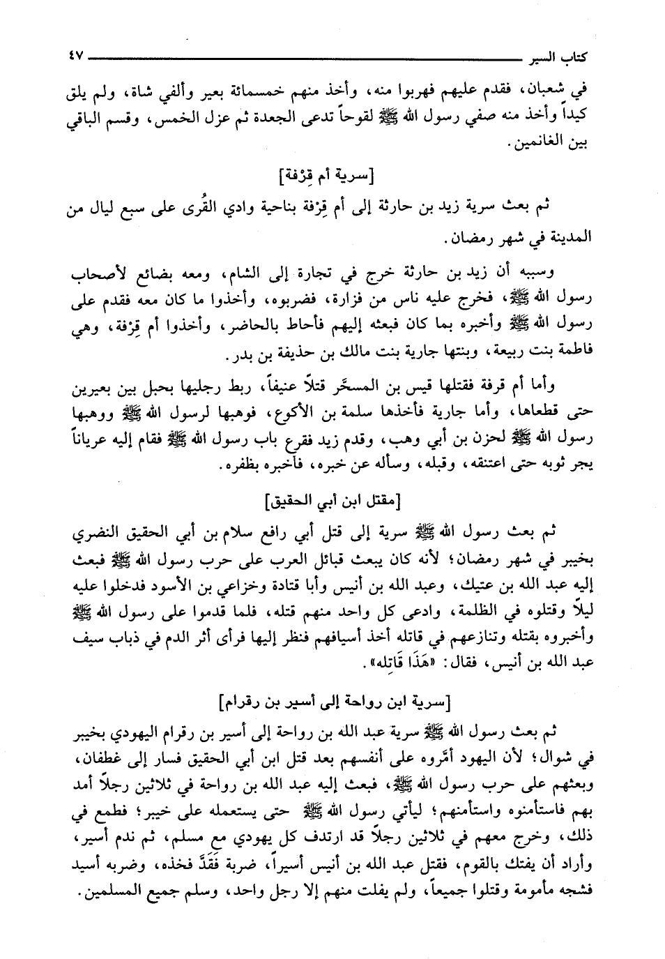 ثُمَّ بَعَثَ سَرِيَّةَ زَيْدِ بْنِ حَارِثَةَ إِلَى أُمِّ قِرْفَةَ بِنَاحِيَةِ وَادِي الْقُرَى عَلَى سَبْعِ لَيَالٍ مِنَ الْمَدِينَةِ فِي شَهْرِ رَمَضَانَ.