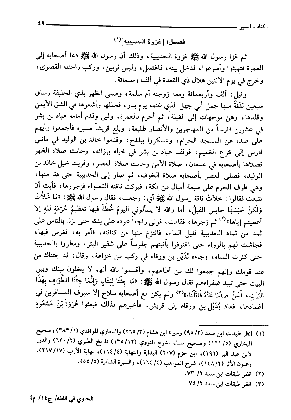 وَقِيلَ: أَلْفٌ وَأَرْبَعُمِائَةٍ وَمَعَهُ زَوْجَتُهُ أُمُّ سَلَمَةَ، وَصَلَّى الظُّهْرَ بِذِي الْحُلَيْفَةِ وَسَاقَ سَبْعِينَ بَدَنَةً مِنْهَا جَمَلُ أَبِي جَهْلٍ الَّذِي غَنِمَهُ يَوْمَ بَدْرٍ، فَحَلَّلَهَا وَأَشْعَرَهَا فِي الشِّقِّ الْأَيْمَنِ وَقَلَّدَهَا، وَهُنَّ مُوَجَّهَاتٌ إِلَى الْقِبْلَةِ، ثُمَّ أَحْرَمَ بِالْعُمْرَةِ، وَلَبَّى وَقَدَّمَ أَمَامَهُ عَبَّادَ بْنَ بِشْرٍ فِي عِشْرِينَ فَارِسًا مِنَ الْمُهَاجِرِينَ وَالْأَنْصَارِ طَلِيعَةً، وَبَلَغَ قُرَيْشًا مَسِيرُهُ فَأَجْمَعُوا رَأْيَهُمْ عَلَى صَدِّهِ عَنِ الْمَسْجِدِ الْحَرَامِ، وَعَسْكَرُوا بِبَلْدَحَ، وَقَدَّمُوا خَالِدَ بْنَ الْوَلِيدِ فِي مِائَتَيْ فَارِسٍ إِلَى كُرَاعِ الْغَمِيمِ، فَوَقَفَ عَبَّادُ بْنُ بِشْرٍ فِي خَيْلِهِ بِإِزَائِهِ، وَحَانَتْ صَلَاةُ الظُّهْرِ فَصَلَّاهَا بِأَصْحَابِهِ فِي عُسْفَانَ، صَلَاةَ الْأَمْنِ وَحَانَتْ صَلَاةُ الْعَصْرِ، وَقَرُبَتْ خَيْلُ خَالِدِ بْنِ الْوَلِيدِ، فَصَلَّى الْعَصْرَ بِأَصْحَابِهِ صَلَاةَ الْخَوْفِ، ثُمَّ صَارَ إِلَى الْحُدَيْبِيَةِ حَتَّى دَنَا مِنْهَا وَهِيَ طَرَفُ الْحَرَمِ عَلَى سَبْعَةِ أَمْيَالٍ مِنْ مَكَّةَ، فَبَرَكَتْ نَاقَتُهُ الْقَصْوَاءُ فَزَجَرُوهَا، فَأَبَتْ أَنْ تَنْبَعِثَ فَقَالُوا: خَلَأَتْ نَاقَةِ رَسُولِ اللَّهِ - صَلَّى اللَّهُ عَلَيْهِ وَسَلَّم َ - أَيْ: رَجَعَتْ، فَقَالَ رَسُولُ اللَّهِ - صَلَّى اللَّهُ عَلَيْهِ وَسَلَّم َ -: " مَا خَلَأَتْ وَلَكِنْ حَبَسَهَا حَابِسُ الْفِيلِ، أَمَا وَاللَّهِ لَا يَسْأَلُونِي الْيَوْمَ خُطَّةً فِيهَا تَعْظِيمُ حرمة لله إلا أعطيتم إِيَّاهَا " ثُمَّ زَجَرَهَا، فَقَامَتْ، فَوَلَّى رَاجِعًا عَوْدَهُ عَلَى بَدْئِهِ حَتَّى نَزَلَ بِالنَّاسِ عَلَى ثَمَدٍ من ثماد الحديبية قليل الماء، فانتزع منها مِنْ كِنَانَتِهِ، فَأَمَرَ بِهِ، فَغُرِسَ فِيهَا فَجَاشَتْ لَهُمْ بِالرِّوَاءِ حَتَّى اغْتَرَفُوا بِآنِيَتِهِمْ جُلُوسًا عَلَى شَفِيرِ الْبِئْرِ، وَمُطِرُوا بِالْحُدَيْبِيَةِ حَتَّى كَثُرَتِ الْمِيَاهُ، وَجَاءَهُ بُدَيْلُ بْنُ وَرْقَاءَ فِي رَكْبٍ مِنْ خُزَاعَةَ، وَقَالَ: قَدْ جِئْنَاكَ مِنْ عِنْدِ قَوْمِكَ وَإِنَّهُمْ جَمَعُوا لَكَ مَنْ أَطَاعَهُمْ، وَأَقْسَمُوا بِاللَّهِ أَنَّهُمْ لَا يُخَلُّونَ بَيْنَكَ وَبَيْنَ الْبَيْتِ حَتَّى تبيد ضفراءهم فَقَالَ رَسُولُ اللَّهِ - صَلَّى اللَّهُ عَلَيْهِ وَسَلَّم َ -: " مَا جِئْنَا لِقِتَالٍ وَإِنَّمَا جِئْنَا لِلطَّوَافِ بِهَذَا الْبَيْتِ، فَمَنْ صَدَّنَا عَنْهُ قَاتَلْنَاهُ " وَلَمْ يَكُنْ مَعَ أَصْحَابِهِ سِلَاحٌ إِلَّا سُيُوفُ الْمُسَافِرِينَ فِي أَغْمَادِهَا، فَعَادَ بُدَيْلُ بْنُ وَرْقَاءَ إِلَى قُرَيْشٍ، فَأَخْبَرَهُمْ بِذَلِكَ فَبَعَثُوا عُرْوَةَ بْنَ مَسْعُودٍ