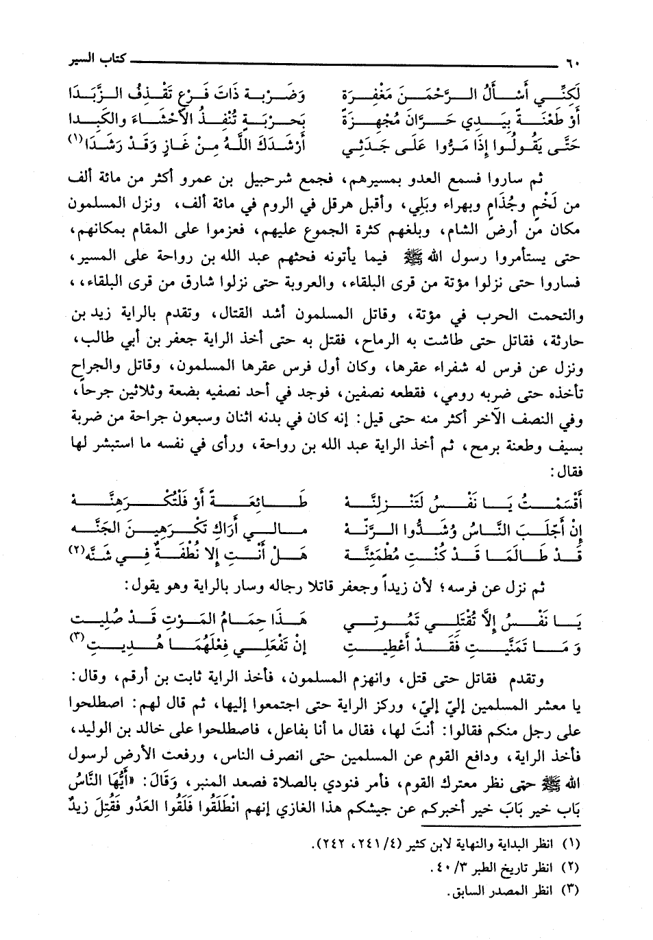 ثُمَّ سَارُوا فَسَمِعَ الْعَدُوُّ بِمَسِيرِهِمْ، فَجَمَعَ شُرَحْبِيلُ بْنُ عَمْرٍو أَكْثَرَ مِنْ مِائَةِ أَلْفٍ مِنْ لَخْمٍ وَجُذَامٍ وَبَهْرَاءَ وَبَلِيٍّ، وَأَقْبَلَ هِرَقْلُ فِي الرُّومِ فِي مِائَةِ أَلْفٍ، وَنَزَلَ المسلمون مكان مِنْ أَرْضِ الشَّامِ، وَبَلَغَهُمْ كَثْرَةُ الْجُمُوعِ عَلَيْهِمْ، فَعَزَمُوا عَلَى الْمَقَامِ بِمَكَانِهِمْ حَتَّى يَسْتَأْمِرُوا رَسُولَ الله - صَلَّى اللَّهُ عَلَيْهِ وَسَلَّم َ - فِيمَا يَأْتُونَهُ فَحَثَّهُمْ عَبْدُ اللَّهِ بْنُ رَوَاحَةَ عَلَى الْمَسِيرِ فَسَارُوا حَتَّى نَزَلُوا مُؤْتَةَ مِنْ قُرَى الْبَلْقَاءِ، وَالْعُرُوبَةِ حَتَّى نَزَلُوا شَارِقَ مِنْ قُرَى الْبَلْقَاءِ وَالْتَحَمَتِ الْحَرْبُ فِي مُؤْتَةَ، وَقَاتَلَ الْمُسْلِمُونَ أَشَدَّ الْقِتَالِ، وَتَقَدَّمَ بِالرَّايَةِ زَيْدُ بْنُ حَارِثَةَ، فَقَاتَلَ حَتَّى طَاشَتْ بِهِ الرِّمَاحُ، فَقُتِلَ به حتى أَخَذَ الرَّايَةَ جَعْفَرُ بْنُ أَبِي طَالِبٍ وَنَزَلَ عن فرس له شفراء عَقَرَهَا، وَكَانَ أَوَّلَ فَرَسٍ عَقَرَهَا الْمُسْلِمُونَ، وَقَاتَلَ وَالْجِرَاحُ تَأْخُذُهُ حَتَّى ضَرَبَهُ رُومِيٌّ، فَقَطَعَهُ نِصْفَيْنِ، فَوُجِدَ فِي أَحَدِ نِصْفَيْهِ بِضْعَةٌ وَثَلَاثِينَ جُرْحًا وَفِي النِّصْفِ الْآخَرِ أَكْثَرُ مِنْهُ حَتَّى قِيلَ: إِنَّهُ كَانَ فِي بَدَنِهِ اثْنَانِ وَسَبْعُونَ جِرَاحَةً مِنْ ضَرْبَةٍ بِسَيْفٍ وَطَعْنَةٍ بِرُمْحٍ، ثُمَّ أَخَذَ الرَّايَةَ عَبْدُ اللَّهِ بْنُ رَوَاحَةَ، وَرَأَى فِي نفسه ما استبشر لها فقال:
