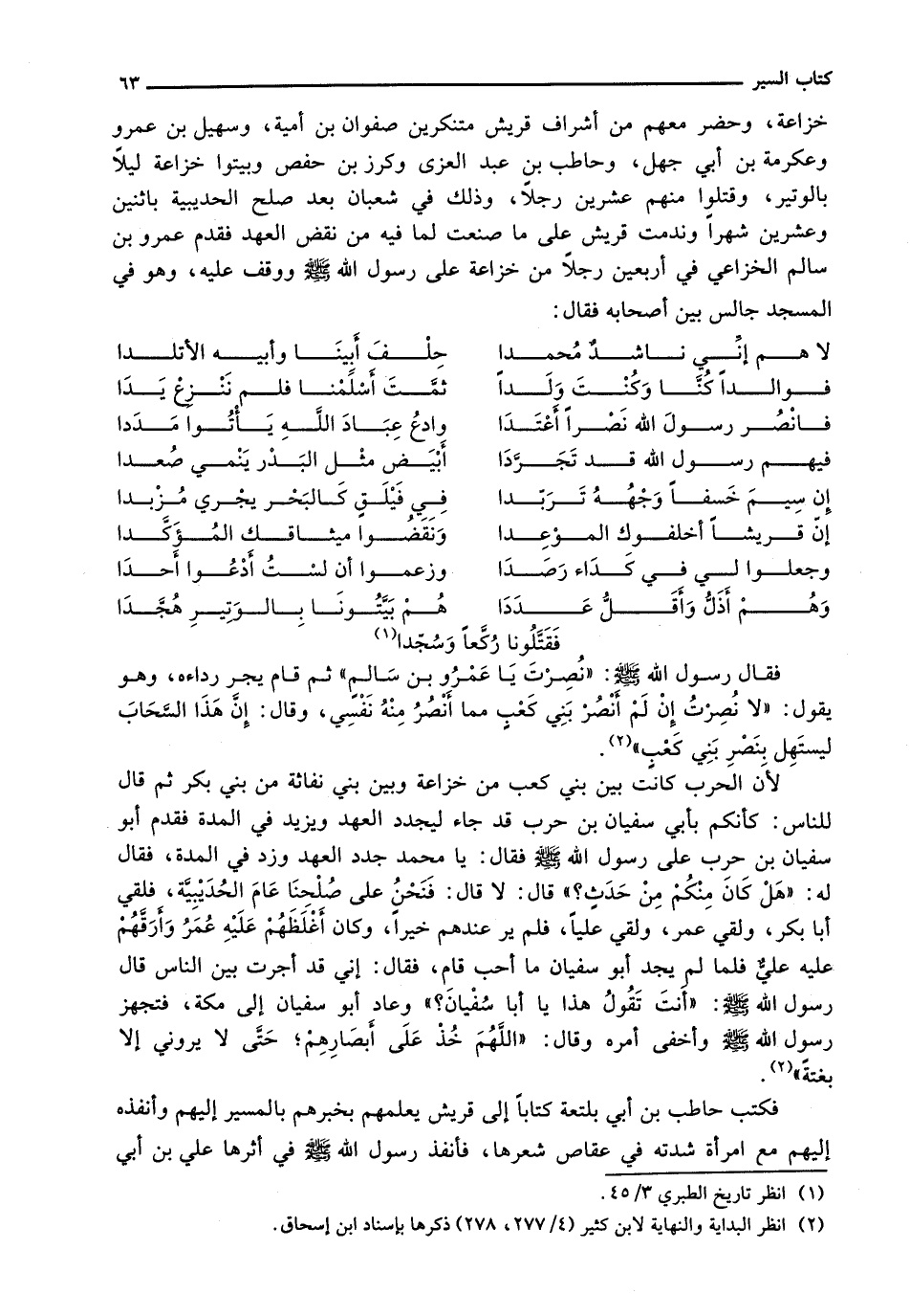 خُزَاعَةَ، وَحَضَرَ مَعَهُمْ مِنْ أَشْرَافِ قُرَيْشٍ مُتَنَكِّرِينَ صَفْوَانُ بْنُ أُمَيَّةَ، وَسُهَيْلُ بْنُ عَمْرٍو وَعِكْرِمَةُ بْنُ أَبِي جَهْلٍ، وَحَاطِبُ بْنُ عَبْدِ الْعُزَّى وَكُرْزُ بْنُ حَفْصٍ وَبَيَّتُوا خُزَاعَةَ لَيْلًا بِالْوَتِيرِ وَقَتَلُوا مِنْهُمْ عِشْرِينَ رَجُلًا، وَذَلِكَ فِي شَعْبَانَ بَعْدَ صُلْحِ الْحُدَيْبِيَةِ بِاثْنَيْنِ وَعِشْرِينَ شَهْرًا وَنَدِمَتْ قُرَيْشٌ عَلَى مَا صَنَعَتْ لِمَا فِيهِ مِنْ نَقْضِ الْعَهْدِ فَقَدِمَ عَمْرُو بْنُ سَالِمٍ الْخُزَاعِيُّ فِي أَرْبَعِينَ رَجُلًا مِنْ خُزَاعَةٍ عَلَى رَسُولِ اللَّهِ - صَلَّى اللَّهُ عَلَيْهِ وَسَلَّم َ - وَوَقَفَ عَلَيْهِ، وَهُوَ فِي الْمَسْجِدِ جَالِسٌ بَيْنَ أَصْحَابِهِ فَقَالَ: