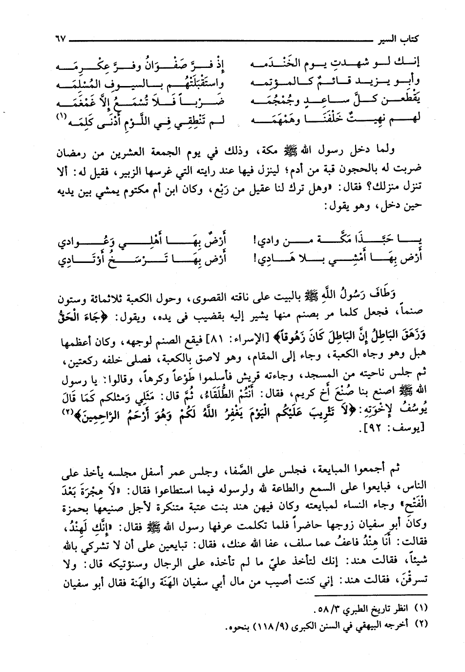 ثُمَّ أَجْمَعُوا الْمُبَايَعَةَ، فَجَلَسَ عَلَى الصَّفَا، وَجَلَسَ عُمَرُ أَسْفَلَ مَجْلِسِهِ يَأْخُذُ عَلَى النَّاسِ، فَبَايَعُوا عَلَى السَّمْعِ وَالطَّاعَةِ لِلَّهِ وَلِرَسُولِهِ فِيمَا اسْتَطَاعُوا فَقَالَ: " لَا هِجْرَةَ بَعْدَ الْفَتْحِ " وَجَاءَ النِّسَاءُ لِمُبَايَعَتِهِ وَكَانَ فِيهِنَّ هِنْدُ بِنْتُ عُتْبَةَ مُتَنَكِّرَةً لِأَجْلِ صَنِيعِهَا بِحَمْزَةَ وَكَانَ أَبُو سُفْيَانَ زَوْجُهَا حَاضِرًا فَلَمَّا تَكَلَّمَتْ عَرَفَهَا رَسُولُ اللَّهِ - صَلَّى اللَّهُ عَلَيْهِ وَسَلَّم َ - فَقَالَ: " إِنَّكِ لَهِنْدُ فَقَالَتْ: أَنَا هِنْدُ فَاعْفُ عَمَّا سَلَفَ، عَفَا اللَّهُ عَنْكَ، فَقَالَ: تُبَايِعِينَ عَلَى أَنْ لَا تُشْرِكِي بِاللَّهِ شَيْئًا، فَقَالَتْ هِنْدُ: إِنَّكَ لَتَأْخُذُ عَلَيَّ مَا لَمْ تَأْخُذْهُ عَلَى الرِّجَالِ وَسَنُؤْتِيكَهُ قَالَ: وَلَا تَسْرِقْنَ، فَقَالَتْ هِنْدُ: إِنِّي كُنْتُ أُصِيبُ مِنْ مَالِ أَبِي سُفْيَانَ الْهَنَّةَ وَالْهَنَّةَ فَقَالَ أَبُو سُفْيَانَ