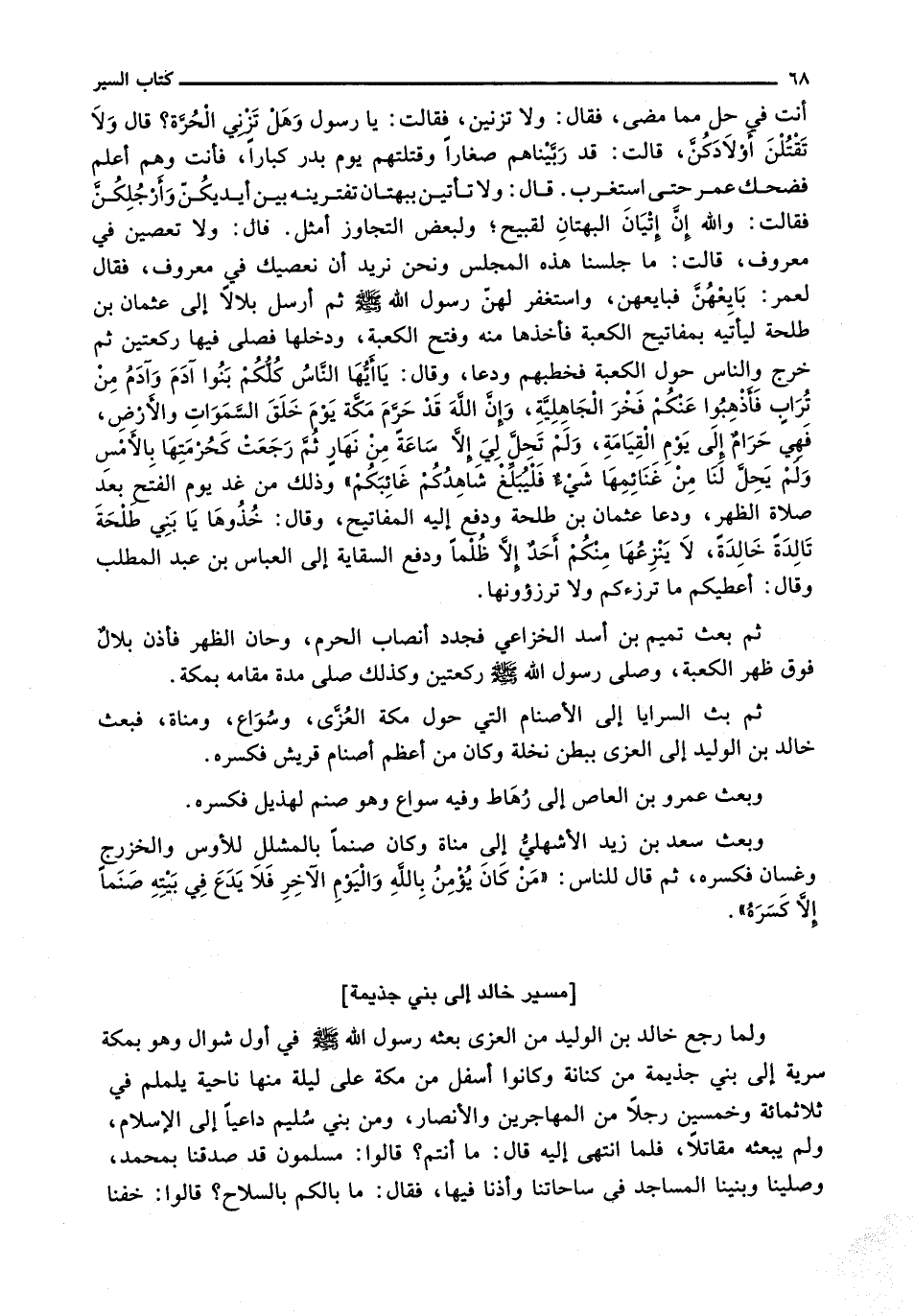 وَلَمَّا رَجَعَ خَالِدُ بْنُ الْوَلِيدِ مِنَ الْعُزَّى بَعَثَهُ رَسُولُ اللَّهِ - صَلَّى اللَّهُ عَلَيْهِ وَسَلَّم َ - فِي أَوَّلِ شَوَّالٍ وَهُوَ بِمَكَّةَ سَرِيَّةً إِلَى بني جذيمة من كنانة وكانوا أسفل من مَكَّةَ عَلَى لَيْلَةٍ مِنْهَا نَاحِيَةَ يَلَمْلَمَ فِي ثَلَاثِمِائَةٍ وَخَمْسِينَ رَجُلًا مِنَ الْمُهَاجِرِينَ وَالْأَنْصَارِ، وَمِنْ بَنِي سُلَيْمٍ دَاعِيًا إِلَى الْإِسْلَامِ وَلَمْ يَبْعَثْهُ مُقَاتِلًا، فَلَمَّا انْتَهَى إِلَيْهِ قَالَ: مَا أَنْتُمْ؟ قَالُوا: مُسْلِمُونَ قَدْ صَدَّقْنَا بِمُحَمَّدٍ وَصَلَّيْنَا وَبَنَيْنَا الْمَسَاجِدَ فِي سَاحَاتِنَا وَأَذَّنَّا فِيهَا، فَقَالَ: مَا بَالِكُمْ بِالسِّلَاحِ؟ قَالُوا: خِفْنَا
