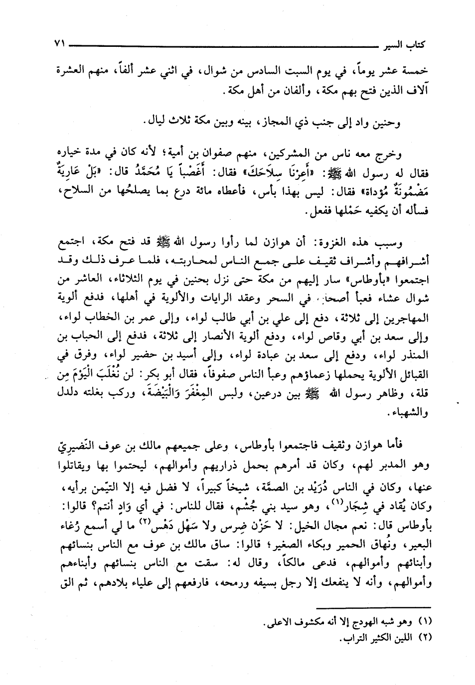 وَخَرَجَ مَعَهُ نَاسٌ مِنَ الْمُشْرِكِينَ، مِنْهُمْ صَفْوَانُ بْنُ أُمَيَّةَ؛ لِأَنَّهُ كَانَ فِي مُدَّةِ خِيَارِهِ فَقَالَ لَهُ رَسُولُ اللَّهِ - صَلَّى اللَّهُ عَلَيْهِ وَسَلَّم َ -: " أعرنا سلاحك " فقال: أغصبيا مُحَمَّدُ قَالَ: " بَلْ عَارِيَةٌ مَضْمُونَةٌ مُؤَدَّاةٌ " فَقَالَ: لَيْسَ بِهَذَا بَأْسٌ، فَأَعْطَاهُ مِائَةَ دِرْعٍ بِمَا يُصْلِحُهَا مِنَ السِّلَاحِ فَسَأَلَهُ أَنْ يَكْفِيَهُ حَمْلَهَا فَفَعَلَ