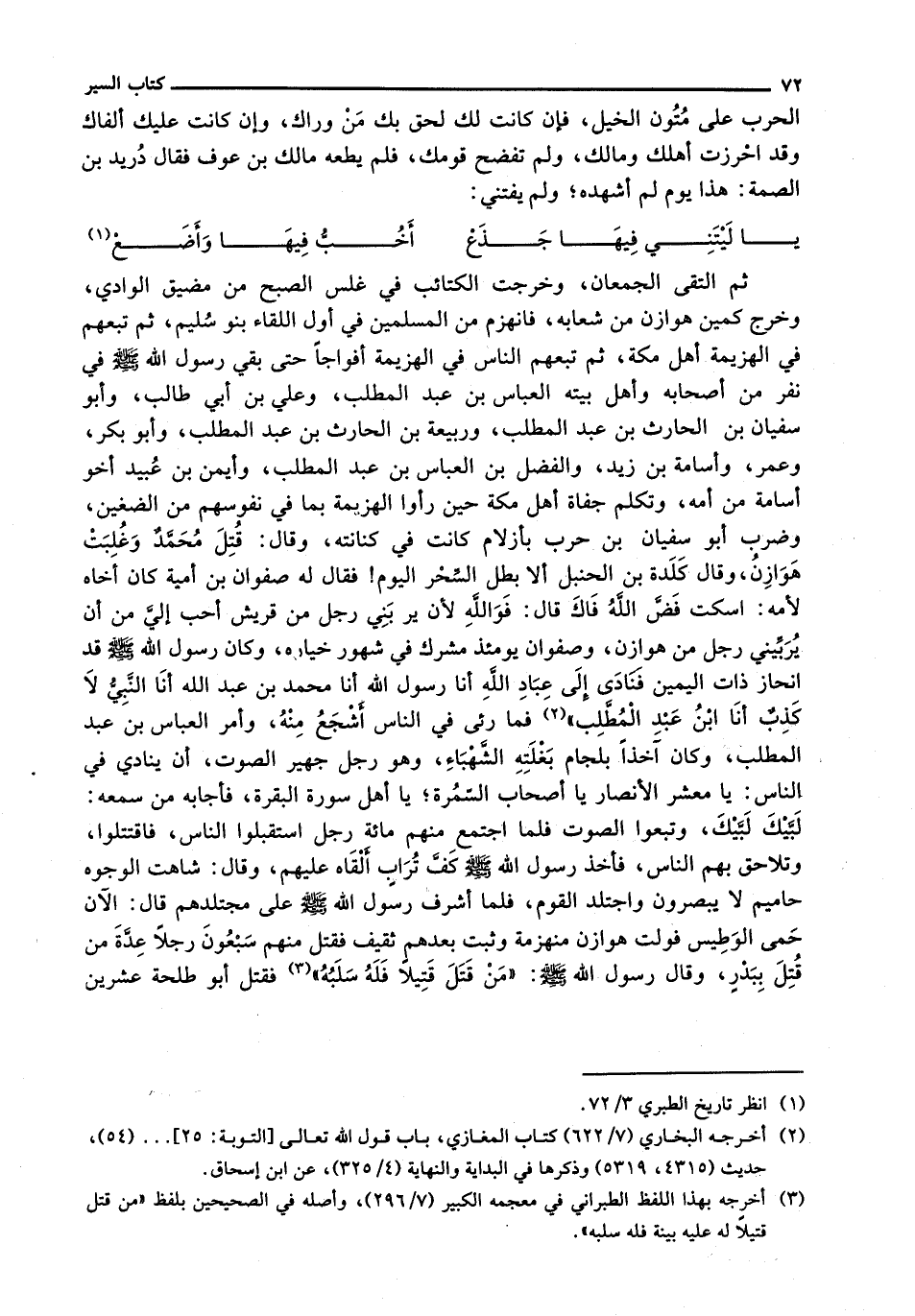 ثُمَّ الْتَقَى الْجَمْعَانِ، وَخَرَجَتِ الْكَتَائِبُ فِي غَلَسِ الصُّبْحِ مِنْ مَضِيقِ الْوَادِي وَخَرَجَ كَمِينُ هَوَازِنَ مِنْ شِعَابِهِ، فَانْهَزَمَ مِنَ الْمُسْلِمِينَ فِي أَوَّلِ اللِّقَاءِ بَنُو سُلَيْمٍ، ثُمَّ تَبِعَهُمْ فِي الْهَزِيمَةِ أَهْلُ مَكَّةَ، ثُمَّ تَبِعَهُمُ النَّاسُ فِي الْهَزِيمَةِ أَفْوَاجًا حَتَّى بَقِيَ رَسُولُ اللَّهِ - صَلَّى اللَّهُ عَلَيْهِ وَسَلَّم َ - فِي نَفَرٍ مِنْ أَصْحَابِهِ وَأَهْلِ بَيْتِهِ الْعَبَّاسُ بْنُ عَبْدِ الْمُطَّلِبِ، وَعَلِيُّ بْنُ أَبِي طَالِبٍ، وَأَبُو سُفْيَانَ بْنُ الْحَارِثِ بْنِ عَبْدِ الْمُطَّلِبِ، وَرَبِيعَةُ بْنُ الْحَارِثِ بْنِ عَبْدِ الْمُطَّلِبِ، وَأَبُو بَكْرٍ وَعُمَرُ، وَأُسَامَةُ بْنُ زَيْدٍ، وَالْفَضْلُ بْنُ الْعَبَّاسِ بْنِ عَبْدِ الْمُطَّلِبِ، وَأَيْمَنُ بْنُ عُبَيْدٍ أَخُو أُسَامَةَ مِنْ أُمِّهِ، وَتَكَلَّمَ جُفَاةُ أَهْلِ مَكَّةَ حِينَ رَأَوُا الْهَزِيمَةَ بِمَا فِي نُفُوسِهِمْ من الضغين وَضَرَبَ أَبُو سُفْيَانَ بْنُ حَرْبٍ بِأَزْلَامٍ كَانَتْ فِي كِنَانَتِهِ، وَقَالَ: قُتِلَ مُحَمَّدٌ وَغُلِبَتْ هَوَازِنُ، وَقَالَ كَلَدَةُ بْنُ الْحَنْبَلِ أَلَا بَطَلَ السِّحْرُ الْيَوْمَ! فَقَالَ لَهُ صَفْوَانُ بْنُ أُمَيَّةَ كَانَ أَخَاهُ لِأُمِّهِ: اسْكُتْ فَضَّ اللَّهُ فَاكَ قَالَ: فوالله لأن ير بني رَجُلٌ مِنْ قُرَيْشٍ أَحَبُّ إِلَيَّ مِنْ أَنْ يُرَبِّيَنِي رَجُلٌ مِنْ هَوَازِنَ، وَصَفْوَانُ يَوْمَئِذٍ مُشْرِكٌ فِي شُهُورِ خِيَارِهِ، وَكَانَ رَسُولُ اللَّهِ - صَلَّى اللَّهُ عَلَيْهِ وَسَلَّم َ - قَدِ انْحَازَ ذَاتَ الْيَمِينِ فَنَادَى إِلَيَّ عِبَادِ اللَّهِ أَنَا رَسُولُ اللَّهِ أَنَا مُحَمَّدُ بْنُ عَبْدِ اللَّهِ أَنَا النَّبِيُّ لَا كَذِبْ أَنَا ابْنُ عَبْدِ الْمُطَّلِبِ " فَمَا رُئِيَ فِي النَّاسِ أَشْجَعُ مِنْهُ، وَأَمَرَ الْعَبَّاسَ بْنَ عَبْدِ الْمُطَّلِبِ، وَكَانَ آخِذًا بِلِجَامِ بَغْلَتِهِ الشَّهْبَاءِ، وَهُوَ رَجُلٌ جَهِيرُ الصَّوْتِ، أَنْ يُنَادِيَ فِي النَّاسِ: يَا مَعْشَرَ الْأَنْصَارِ يَا أَصْحَابَ السَّمُرَةِ؛ يَا أَهْلَ سُورَةِ الْبَقَرَةِ، فَأَجَابَهُ مَنْ سَمِعَهُ: لَبَّيْكَ لَبَّيْكَ، وَتَبِعُوا الصَّوْتَ فَلَمَّا اجْتَمَعَ مِنْهُمْ مِائَةُ رَجُلٍ اسْتَقْبَلُوا النَّاسَ، فَاقْتَتَلُوا وَتَلَاحَقَ بِهِمُ النَّاسُ، فَأَخَذَ رَسُولُ اللَّهِ - صَلَّى اللَّهُ عَلَيْهِ وَسَلَّم َ - كَفَّ تُرَابٍ أَلْقَاهُ عَلَيْهِمْ، وَقَالَ: شَاهَتِ الْوُجُوهُ حاميم لَا يُبْصِرُونَ وَاجْتَلَدَ الْقَوْمُ، فَلَمَّا أَشْرَفَ رَسُولُ الله - صَلَّى اللَّهُ عَلَيْهِ وَسَلَّم َ - عَلَى مُجْتَلَدِهِمْ قَالَ: الْآنَ حَمَى الْوَطِيسُ فَوَلَّتْ هَوَازِنُ مُنْهَزِمَةً وَثَبَتَ بَعْدَهُمْ ثَقِيفٌ فَقُتِلَ مِنْهُمْ سَبْعُونَ رَجُلًا عِدَّةَ مَنْ قُتِلَ بِبَدْرٍ، وَقَالَ رَسُولُ اللَّهِ - صَلَّى اللَّهُ عَلَيْهِ وَسَلَّم َ -: " مَنْ قَتَلَ قَتِيلًا فَلَهُ سَلَبُهُ " فَقَتَلَ أَبُو طلحة عشرين