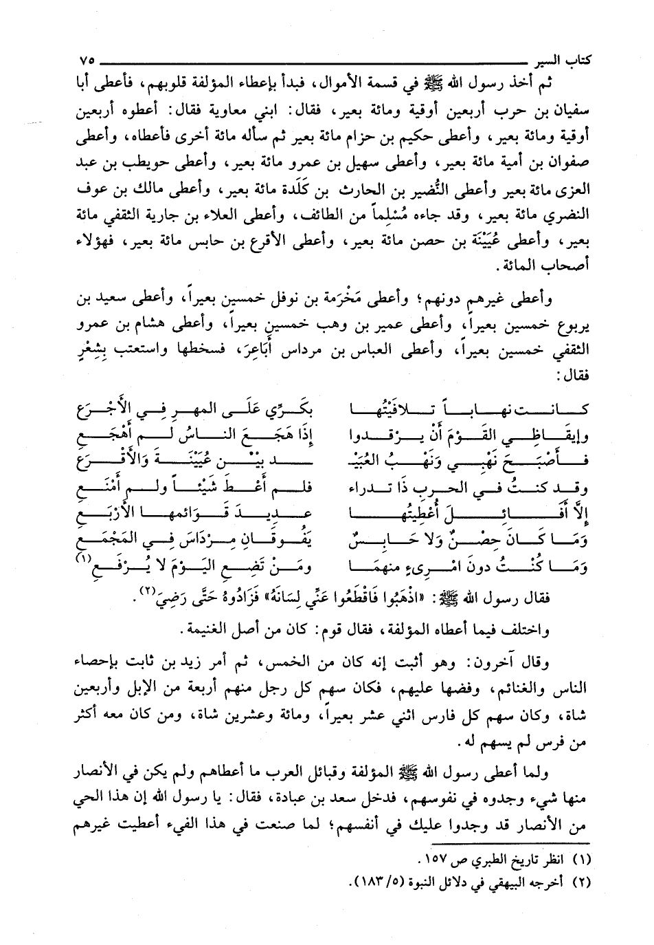 ثُمَّ أَخَذَ رَسُولُ اللَّهِ - صَلَّى اللَّهُ عَلَيْهِ وَسَلَّم َ - فِي قِسْمَةِ الْأَمْوَالِ، فَبَدَأَ بِإِعْطَاءِ الْمُؤَلَّفَةِ قُلُوبُهُمْ، فَأَعْطَى أَبَا سُفْيَانَ بْنَ حَرْبٍ أَرْبَعِينَ أُوقِيَّةً وَمِائَةَ بَعِيرٍ، فَقَالَ: ابْنِي مُعَاوِيَةُ فَقَالَ: أَعْطُوهُ أَرْبَعِينَ أُوقِيَّةً وَمِائَةَ بَعِيرٍ، وَأَعْطَى حَكِيمَ بْنَ حِزَامٍ مِائَةَ بَعِيرٍ ثُمَّ سَأَلَهُ مِائَةً أُخْرَى فَأَعْطَاهُ، وَأَعْطَى صَفْوَانَ بْنَ أُمَيَّةَ مِائَةَ بَعِيرٍ، وَأَعْطَى سُهَيْلَ بْنَ عَمْرٍو مِائَةَ بَعِيرٍ، وَأَعْطَى حويطب بن عبد العزى مِائَةَ بَعِيرٍ، وَقَدْ جَاءَهُ مُسْلِمًا مِنَ الطَّائِفِ، وَأَعْطَى الْعَلَاءَ بْنَ جَارِيَةَ الثَّقَفِيَّ مِائَةَ بَعِيرٍ وأعطى النضير بن الحارث بن كلدة ماثة بَعِيرٍ، وَأَعْطَى مَالِكَ بْنَ عَوْفٍ النَّضْرِيَّ مِائَةَ بَعِيرٍ وَأَعْطَى عُيَيْنَةَ بْنَ حِصْنٍ مِائَةَ بَعِيرٍ، وَأَعْطَى الْأَقْرَعَ بْنَ حَابِسٍ مِائَةَ بَعِيرٍ، فَهَؤُلَاءِ أَصْحَابُ الْمِائَةِ