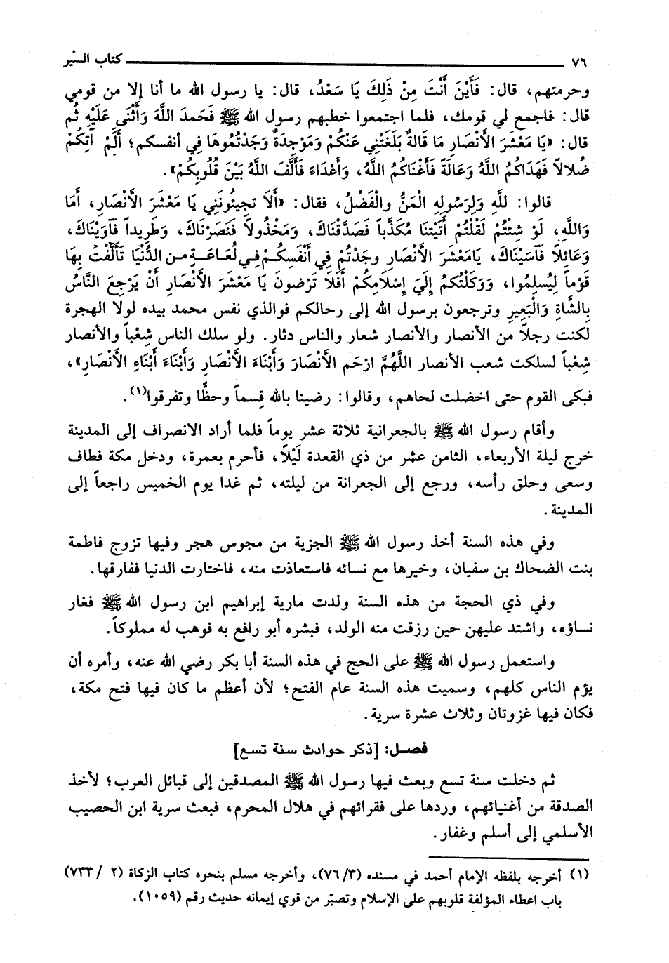 ثُمَّ دَخَلَتْ سَنَةُ تِسْعٍ وَبَعَثَ فِيهَا رَسُولُ اللَّهِ - صَلَّى اللَّهُ عَلَيْهِ وَسَلَّم َ - الْمُصَدِّقِينَ إِلَى قَبَائِلِ الْعَرَبِ؛ لِأَخْذِ الصَّدَقَةِ مِنْ أَغْنِيَائِهِمْ، وَرَدِّهَا عَلَى فُقَرَائِهِمْ فِي هِلَالِ الْمُحَرَّمِ، فَبَعَثَ سَرِيَّةَ ابْنِ الْحُصَيْبِ الْأَسْلَمِيِّ إِلَى أَسْلَمَ وغفار