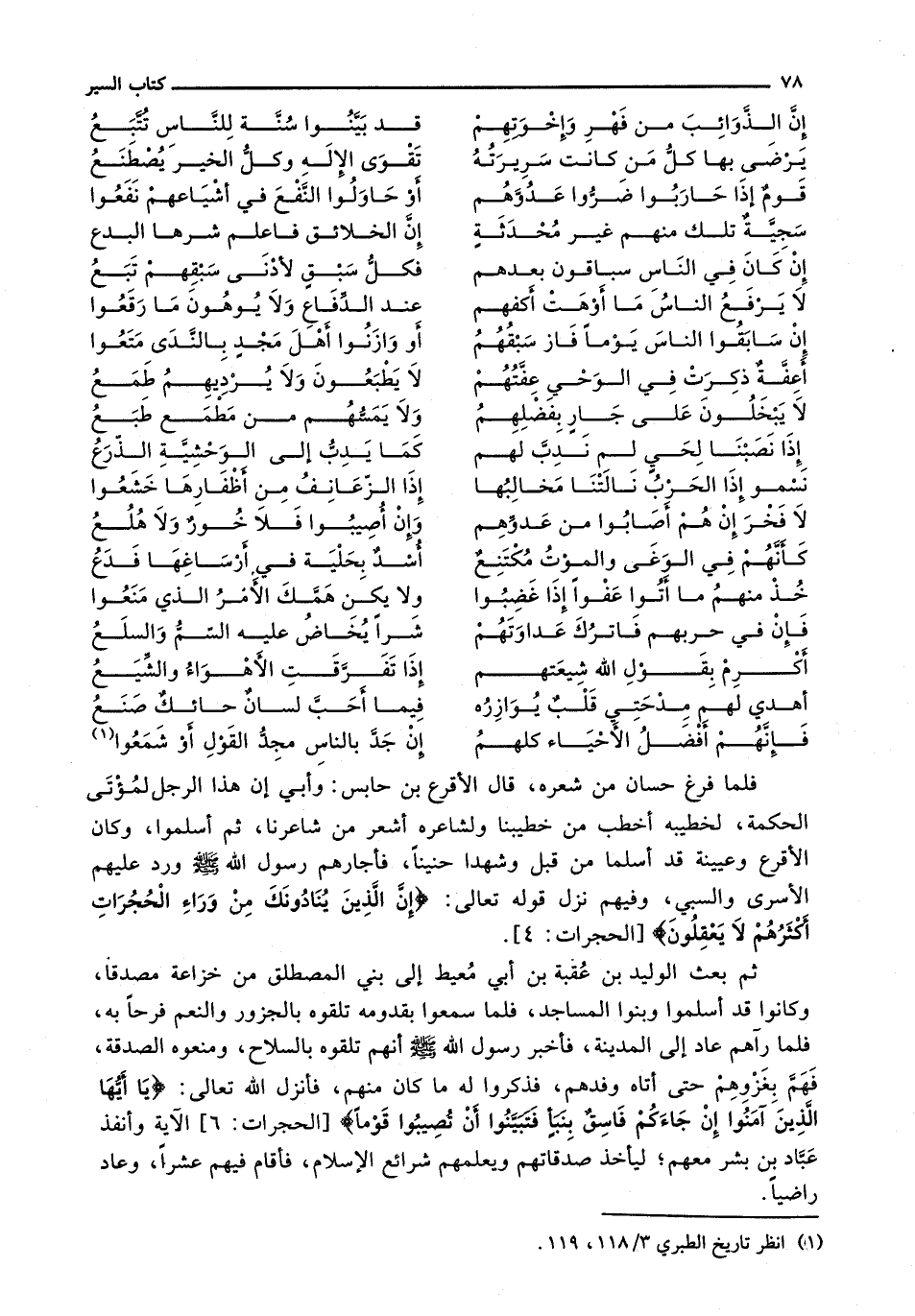 فَلَمَّا فَرَغَ حَسَّانُ مِنْ شِعْرِهِ، قَالَ الْأَقْرَعُ بْنُ حَابِسٍ: وَأَبِي إِنَّ هَذَا الرَّجُلَ لَمُؤْتَى الْحِكْمَةَ، لَخَطِيبُهُ أَخْطَبُ مِنْ خَطِيبِنَا وَلَشَاعِرُهُ أَشْعَرُ مِنْ شَاعِرِنَا، ثُمَّ أَسْلَمُوا، وَكَانَ الْأَقْرَعُ وَعُيَيْنَةُ قَدْ أَسْلَمَا مِنْ قَبْلُ وَشَهِدَا حُنَيْنًا، فَأَجَارَهُمْ رسول الله - صَلَّى اللَّهُ عَلَيْهِ وَسَلَّم َ - وَرَدَّ عَلَيْهِمُ الْأَسْرَى وَالسَّبْيَ، وَفِيهِمْ نَزَلَ قَوْله تَعَالَى {إِنَّ الَّذِينَ يُنَادُونَكَ مِنْ وَرَاءِ الْحُجُرَاتِ أَكْثَرُهُمْ لا يَعْقِلُونَ} [الحجرات: 4]