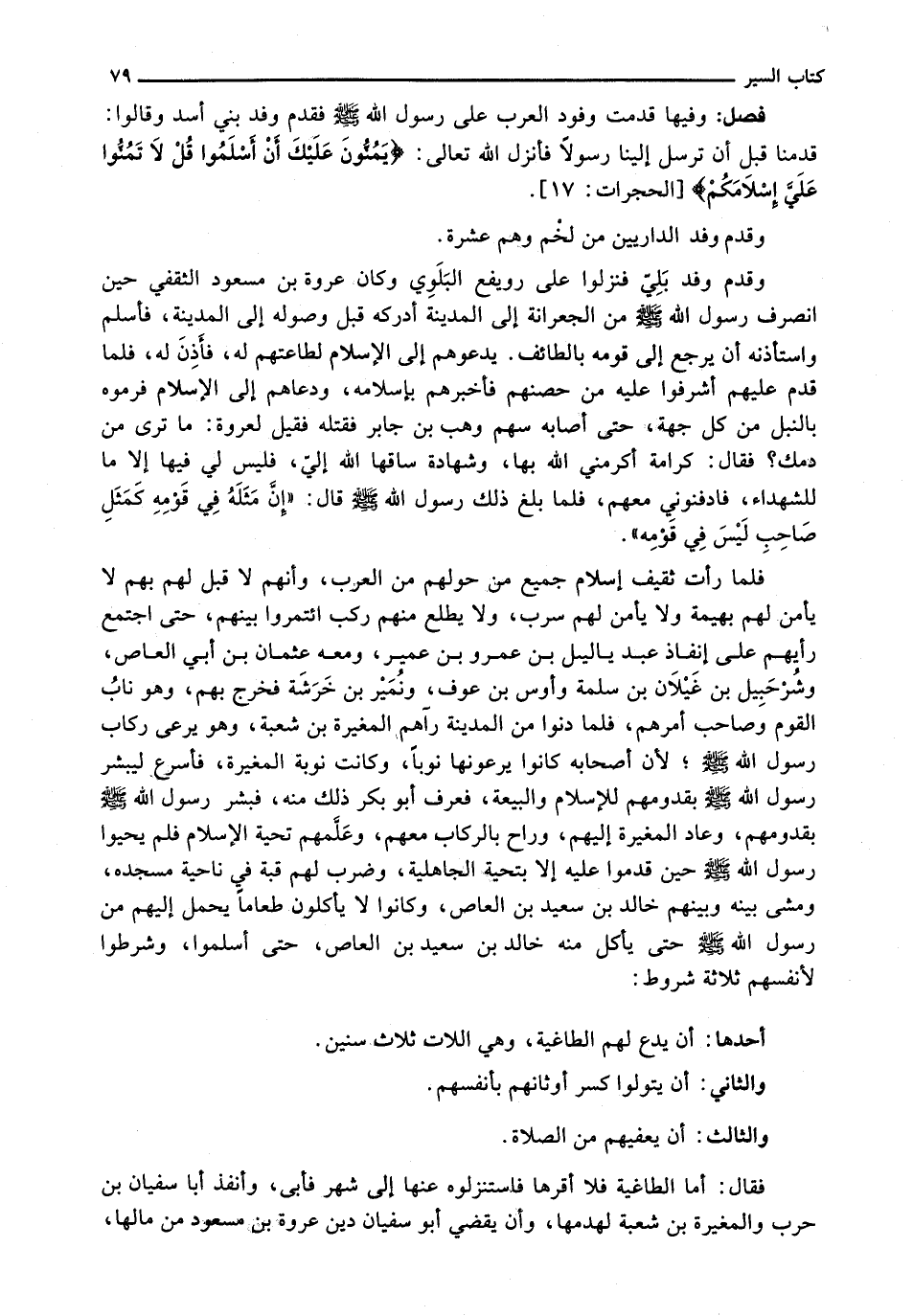 فَلَمَّا رَأَتْ ثَقِيفٌ إِسْلَامَ جَمِيعِ مَنْ حَوْلَهُمْ مِنَ الْعَرَبِ، وَأَنَّهُمْ لَا قِبَلَ لَهُمْ بِهِمْ لَا يَأْمَنُ لَهُمْ بَهِيمَةٌ وَلَا يَأْمَنُ لَهُمْ سِرْبٌ، وَلَا يَطْلُعُ مِنْهُمْ ركب ائتمروا بينهم وحتى اجْتَمَعَ رَأْيُهُمْ عَلَى إِنْفَاذِ عَبْدِ يَالِيلَ بْنِ عَمْرِو بْنِ عُمَيْرٍ، وَمَعَهُ عُثْمَانُ بْنُ أَبِي الْعَاصِ وَشُرَحَبِيلُ بْنُ غَيْلَانَ بْنِ سَلَمَةَ وَأَوْسُ بْنُ عَوْفٍ، وَنُمَيْرُ بْنُ خَرَشَةَ فَخَرَجَ بِهِمْ، وَهُوَ نَابُ الْقَوْمِ وَصَاحِبُ أَمْرِهِمْ، فَلَمَّا دَنَوْا مِنَ الْمَدِينَةِ رَآهُمُ الْمُغِيرَةُ بْنُ شُعْبَةَ، وَهُوَ يَرْعَى رِكَابَ رَسُولِ اللَّهِ - صَلَّى اللَّهُ عَلَيْهِ وَسَلَّم َ -؛ لِأَنَّ أَصْحَابَهُ كَانُوا يَرْعَوْنَهَا نَوْبًا، وَكَانَتْ نَوْبَةُ الْمُغِيرَةِ، فَأَسْرَعَ لِيُبَشِّرَ رَسُولَ اللَّهِ - صَلَّى اللَّهُ عَلَيْهِ وَسَلَّم َ - بِقُدُومِهِمْ لِلْإِسْلَامِ وَالْبَيْعَةِ، فَعَرَفَ أَبُو بَكْرٍ ذَلِكَ مِنْهُ، فَبَشَّرَ رَسُولَ اللَّهِ - صَلَّى اللَّهُ عَلَيْهِ وَسَلَّم َ - بِقُدُومِهِمْ، وَعَادَ الْمُغِيرَةُ إِلَيْهِمْ، وَرَاحَ بِالرِّكَابِ مَعَهُمْ، وَعَلَّمَهُمْ تَحِيَّةَ الْإِسْلَامِ فَلَمْ يُحَيُّوا رَسُولَ اللَّهِ - صَلَّى اللَّهُ عَلَيْهِ وَسَلَّم َ - حِينَ قَدِمُوا عَلَيْهِ إِلَّا بِتَحِيَّةِ الْجَاهِلِيَّةِ، وَضَرَبَ لَهُمْ قُبَّةً فِي نَاحِيَةِ مَسْجِدِهِ وَمَشَى بَيْنَهُ وَبَيْنَهُمْ خَالِدُ بْنُ سَعِيدِ بْنِ الْعَاصِ، وَكَانُوا لَا يَأْكُلُونَ طَعَامًا يُحْمَلُ إِلَيْهِمْ مِنْ رَسُولِ اللَّهِ - صَلَّى اللَّهُ عَلَيْهِ وَسَلَّم َ - حَتَّى يَأْكُلَ مِنْهُ خَالِدُ بْنُ سَعِيدِ بْنِ الْعَاصِ، حَتَّى أَسْلَمُوا، وَشَرَطُوا لِأَنْفُسِهِمْ ثَلَاثَةَ شُرُوطٍ: