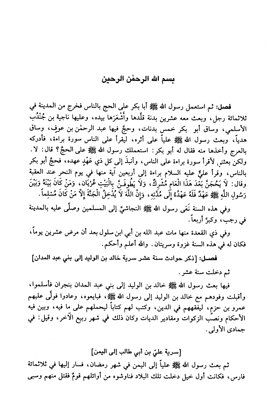 فَصْلٌ: ثُمَّ اسْتَعْمَلَ رَسُولُ اللَّهِ - صَلَّى اللَّهُ عَلَيْهِ وَسَلَّم َ - أَبَا بَكْرٍ عَلَى الْحَجِّ بِالنَّاسِ فَخَرَجَ مِنَ الْمَدِينَةِ فِي ثَلَاثِمِائَةِ رَجُلٍ، وَبَعَثَ مَعَهُ عِشْرِينَ بَدَنَةً قَلَّدَهَا وَأَشْعَرَهَا بِيَدِهِ، وَعَلَيْهَا نَاجِيَةُ بْنُ جُنْدُبٍ الْأَسْلَمِيُّ، وَسَاقَ أَبُو بَكْرٍ خَمْسَ بَدَنَاتٍ، وَحَجَّ فِيهَا عَبْدُ الرَّحْمَنِ بْنُ عَوْفٍ، وَسَاقَ هَدْيًا، وَبَعَثَ رَسُولُ اللَّهِ - صَلَّى اللَّهُ عَلَيْهِ وَسَلَّم َ - عَلِيًّا عَلَى أَثَرِهِ، لِيَقْرَأَ عَلَى النَّاسِ سُورَةَ بَرَاءَةٌ، فَأَدْرَكَهُ بِالْعَرَجِ وَأَخَذَهَا مِنْهُ فَقَالَ لَهُ أَبُو بَكْرٍ: اسْتَعْمَلَكَ رَسُولُ اللَّهِ - صَلَّى اللَّهُ عَلَيْهِ وَسَلَّم َ - عَلَى الْحَجِّ؟ قَالَ: لَا وَلَكِنْ بَعَثَنِي لِأَقْرَأَ سُورَةَ بَرَاءَةٌ عَلَى النَّاسِ، وَأَنْبِذَ إِلَى كُلِّ ذِي عَهْدٍ عَهْدَهُ، فَحَجَّ أَبُو بَكْرٍ بِالنَّاسِ، وَقَرَأَ عَلِيٌّ عَلَيْهِ السَّلَامُ بَرَاءَةٌ إِلَى أَرْبَعِينَ آيَةً مِنْهَا فِي يَوْمِ النَّحْرِ عِنْدَ الْعَقَبَةِ وَقَالَ: لَا يَحُجَنَّ بَعْدَ هَذَا الْعَامِ مُشْرِكٌ، وَلَا يَطُوفَنَّ بِالْبَيْتِ عُرْيَانٌ، وَمَنْ كَانَ بَيْنَهُ وَبَيَّنَ رَسُولُ اللَّهِ - صَلَّى اللَّهُ عَلَيْهِ وَسَلَّم َ - عَهْدٌ فَلَهُ عَهْدُهُ إِلَى مُدَّتِهِ، وَإِنَّ اللَّهَ لَا يُدْخِلُ الْجَنَّةَ إِلَّا مَنْ كَانَ مُسْلِمًا.