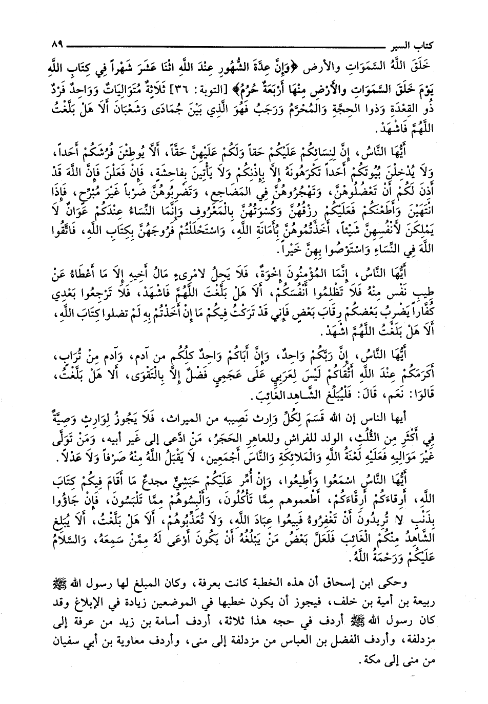 وَحَكَى ابْنُ إِسْحَاقَ أَنَّ هَذِهِ الْخُطْبَةَ كَانَتْ بِعَرَفَةَ، وَكَانَ الْمُبَلِّغُ لَهَا رَسُولُ اللَّهِ - صَلَّى اللَّهُ عَلَيْهِ وَسَلَّم َ - رَبِيعَةَ بْنَ أُمَيَّةَ بْنِ خَلَفٍ، فَيَجُوزُ أَنْ يَكُونَ خَطَبَهَا فِي الْمَوْضِعَيْنِ زِيَادَةً فِي الْإِبْلَاغِ وَقَدْ كَانَ رَسُولُ اللَّهِ - صَلَّى اللَّهُ عَلَيْهِ وَسَلَّم َ - أَرْدَفَ فِي حَجِّهِ هَذَا ثَلَاثَةً، أَرْدَفَ أُسَامَةَ بْنَ زَيْدٍ مِنْ عَرَفَةَ إِلَى مُزْدَلِفَةَ، وَأَرْدَفَ الْفَضْلَ بْنَ الْعَبَّاسِ مِنْ مُزْدَلِفَةَ إِلَى مِنًى ووأردف مُعَاوِيَةَ بْنَ أَبِي سُفْيَانَ مِنْ مِنًى إِلَى مكة