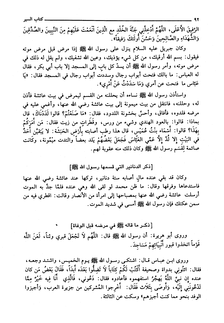 وَكَانَ جِبْرِيلُ عَلَيْهِ السَّلَامُ يَنْزِلُ عَلَى رَسُولِ اللَّهِ - صَلَّى اللَّهُ عَلَيْهِ وَسَلَّم َ - إذا مرض قبل مرض موته فيقول: بسم اللَّهِ أَرْقِيكَ، مِنْ كُلِّ شَيْءٍ يُؤْذِيكَ، وَعَيْنُ اللَّهِ تَشْفِيكَ، وَلَمْ يَقُلْ لَهُ ذَلِكَ فِي مَرَضِ مَوْتِهِ، وَأَمَّرَ رَسُولُ اللَّهِ - صَلَّى اللَّهُ عَلَيْهِ وَسَلَّم َ - أَنْ يُسَدَّ كُلُّ بَابٍ إِلَى الْمَسْجِدِ إِلَّا بَابَ أَبِي بَكْرٍ، فَقَالَ لَهُ الْعَبَّاسُ: مَا بَالُكَ فَتَحْتَ أَبْوَابَ رِجَالٍ وَسَدَدْتَ أَبْوَابَ رِجَالٍ فِي الْمَسْجِدِ فَقَالَ: " يَا عَبَّاسُ مَا فَتَحْتُ عَنْ أَمْرِي وَمَا سَدَدْتُ عَنْ أَمْرِي "