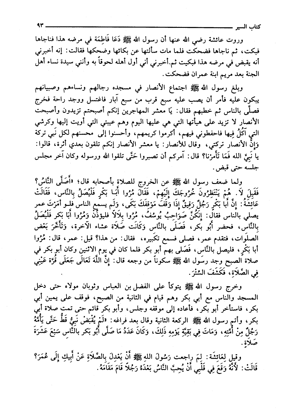 وَلَمَّا ضَعُفَ رَسُولُ اللَّهِ - صَلَّى اللَّهُ عَلَيْهِ وَسَلَّم َ - عَنِ الْخُرُوجِ لِلصَّلَاةِ بِأَصْحَابِهِ قَالَ؛ " أَصَلَّى النَاسُ؟ فَقَيِلَ لَا. هُمْ يَنْتَظِرُونَ خُرُوجَكَ إِلَيْهِمْ، فَقَالَ مُرُوا أَبَا بَكْرٍ فَلْيُصَلِّ بِالنَّاسِ، فَقَالَتْ عَائِشَةُ: إِنَّ أَبَا بَكْرٍ رَجُلٌ رَقِيقٌ إِذَا وَقَفَ مَوْقِفَكَ بَكَى، وَلَمْ يُسْمِعِ النَّاسَ فَلَوْ أَمَرْتَ عُمَرَ يُصَلِّي بِالنَّاسِ فَقَالَ: إِنَّكُنَّ صَوَاحِبُ يُوسُفَ، مُرُوا بِلَالًا فَلْيُؤَذِّنْ وَمُرُوا أَبَا بَكْرٍ فَلْيُصَلِّ بِالنَاسِ، فَحَضَرَ أَبُو بَكْرٍ، فَصَلَّى بِالنَّاسِ وَكَانَتْ صَلَاةَ عِشَاءِ الْآخِرَةِ، وَتَأَخَّرَ بَعْضَ الصَّلَوَاتِ، فَتَقَدَّمَ عُمَرُ، فَصَلَّى فَسَمِعَ تَكْبِيرَهُ، فَقَالَ: مَنْ هَذَا؟ قِيلَ: عُمَرُ، قَالَ: مُرُوا أَبَا بَكْرٍ، فَلْيُصَلِّ بِالنَّاسِ، فَصَلَّى بِهِمْ أَبُو بَكْرٍ فَلَمَّا كَانَ في يوم االاثنين وَكَانَ أَبُو بَكْرٍ فِي صَلَاةِ الصُّبْحِ وَجَدَ رَسُولُ اللَّهِ - صَلَّى اللَّهُ عَلَيْهِ وَسَلَّم َ - سُكُونًا مِنْ وَجَعِهِ قَالَ: إِنَّ اللَّهَ تَعَالَى جعلني قُرَّةَ عَيْنِي فِي الصَّلَاةِ، فَكَشَفَ السِّتْرَ