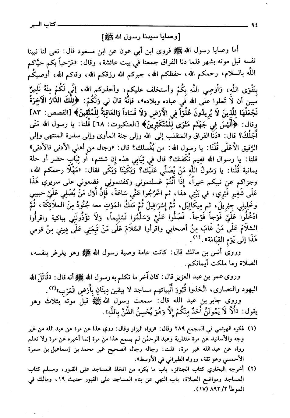 أَمَّا وَصَايَا رَسُولِ اللَّهِ - صَلَّى اللَّهُ عَلَيْهِ وَسَلَّم َ - فَرَوَى ابْنُ أَبِي عَوْنٍ عَنِ ابْنِ مَسْعُودٍ قَالَ: نَعَى لَنَا نَبِيُّنَا نَفْسَهُ قَبْلَ مَوْتِهِ بِشَهْرٍ فَلَمَّا دَنَا الْفِرَاقُ جَمَعَنَا فِي بَيْتِ عَائِشَةَ، وَقَالَ: " مَرْحَبًا بِكُمْ حَيَّاكُمُ اللَّهُ بِالسَّلَامِ، رَحِمَكُمُ اللَّهُ، حَفِظَكُمُ اللَّهُ، جَبَرَكُمُ اللَّهُ رَزَقَكُمُ اللَّهُ، وَقَاكُمُ اللَّهُ، أُوصِيكُمْ بِتَقْوَى اللَّهِ، وَأُوصِي اللَّهَ بِكُمْ وَأَسْتَخْلِفُ عَلَيْكُمْ، وَأُحَذِّرُكُمُ اللَّهَ، إِنِّي لَكُمْ مِنْهُ نَذِيرٌ مُبِينٌ أَنْ لَا تَعْلُوا عَلَى اللَّهِ فِي عِبَادِهِ وَبِلَادِهِ " فَإِنَّهُ قَالَ لِي وَلَكُمْ: {تِلْكَ الدَّارُ الآخِرَةُ نَجْعَلُهَا لِلَّذِينَ لا يُرِيدُونَ عُلُوًّا فِي الأَرْضِ وَلا فَسَادًا وَالْعَاقِبَةُ لِلْمُتَّقِينَ} [القصص: 83] وَقَالَ: {أَلَيْسَ فِي جَهَنَّمَ مثوى للمتكبرين} [العنكبوت: 68] قُلْنَا: يَا رَسُولَ اللَّهِ مَتَى أَجَلُكَ؟ قَالَ: " دَنَا الْفِرَاقُ وَالْمُنْقَلَبُ إِلَى اللَّهِ وَإِلَى جَنَّةِ الْمَأْوَى وَإِلَى سِدْرَةِ الْمُنْتَهَى وَإِلَى الرَّفِيقِ الْأَعْلَى قُلْنَا: يَا رَسُولَ اللَّهِ: مَنْ يُغَسِّلُكَ؟ قَالَ: " رِجَالٌ مِنْ أَهْلِي الْأَدْنَى فَالْأَدْنَى " قُلْنَا يَا رَسُولَ اللَّهِ فَفِيمَ نُكَفِّنُكَ؟ قَالَ فِي ثِيَابِي هَذِهِ إِنْ شِئْتُمْ، أَوْ ثِيَابِ حَضَرٍ أَوْ حُلَّةٍ يَمَانِيَةٍ قُلْنَا: يَا رَسُولَ اللَّهِ مَنْ يُصَلِّي عَلَيْكَ؟ وَبَكَيْنَا وَبَكَى فَقَالَ: " مَهْلًا رَحِمَكُمُ اللَّهُ وَجَزَاكُمْ عَنْ نَبِيِّكُمْ خَيْرًا، إِذَا أَنْتُمْ غَسَّلْتُمُونِي وَكَفَّنْتُمُونِي فَضَعُونِي عَلَى سَرِيرِي هَذَا عَلَى شَفِيرِ قَبْرِي، فِي بَيْتِي هَذَا، ثُمَّ اخْرُجُوا عَنِّي سَاعَةً، فَإِنَّ أَوَّلَ مَنْ يُصَلِّي عَلَيَّ حَبِيبِي وَخَلِيلِي جِبْرِيلُ، ثُمَّ مِيكَائِيَلُ، ثُمَّ إِسْرَافِيلُ، ثُمَّ مَلَكُ الْمَوْتِ مَعَهُ جُنُودٌ مِنَ الْمَلَائِكَةِ، ثُمَّ ادْخُلُوا عَلَيَّ فَوْجًا فَوْجًا. فَصَلُّوا عَلَيَّ وسلموا تسليما، ولا تؤذونني بباكية واقرأوا السلام على من غاب من أصحابي واقرأوا السلام على من تبعني على دِينِي مِنْ قَوْمِي هَذَا إِلَى يَوْمِ الْقِيَامَةِ "