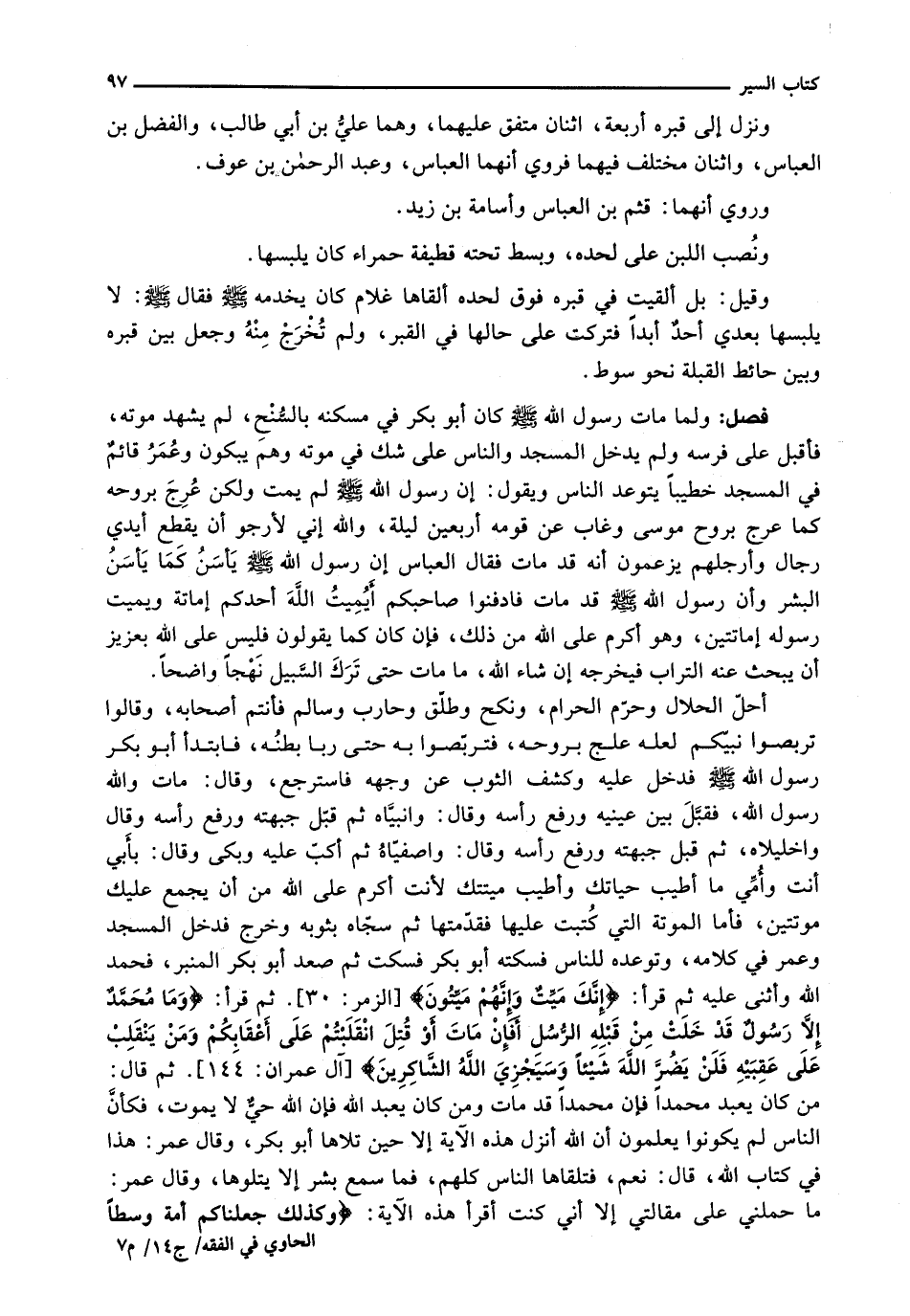 فَصْلٌ: وَلَمَّا مَاتَ رَسُولُ اللَّهِ - صَلَّى اللَّهُ عَلَيْهِ وَسَلَّم َ - كان أبو بكر في مسكنه بالسنح، ولم يَشْهَدْ مَوْتَهُ فَأَقْبَلَ عَلَى فَرَسِهِ وَلَمْ يَدْخُلِ الْمَسْجِدَ وَالنَّاسُ عَلَى شَكٍّ فِي مَوْتِهِ وَهُمْ يَبْكُونَ وَعُمَرُ قَائِمٌ فِي الْمَسْجِدِ خَطِيبًا يَتَوَعَّدُ النَّاسَ وَيَقُولُ: إِنَّ رَسُولَ اللَّهِ - صَلَّى اللَّهُ عَلَيْهِ وَسَلَّم َ - لَمْ يَمُتْ وَلَكِنْ عُرِجَ بِرُوحِهِ كَمَا عُرِجَ بِرُوحِ مُوسَى وَغَابَ عَنْ قَوْمِهِ أَرْبَعِينَ لَيْلَةً، وَاللَّهِ إِنِّي لَأَرْجُو أَنْ يُقْطَعَ أَيْدِي رِجَالٍ وَأَرْجُلُهُمْ يَزْعُمُونَ أَنَّهُ قَدْ مَاتَ فَقَالَ الْعَبَّاسُ أَنَّ رَسُولَ اللَّهِ - صَلَّى اللَّهُ عَلَيْهِ وَسَلَّم َ - يَأْسَنُ كَمَا يَأْسَنُ الْبَشَرُ وَأَنَّ رَسُولَ اللَّهِ - صَلَّى اللَّهُ عَلَيْهِ وَسَلَّم َ - قَدْ مَاتَ فَادْفِنُوا صَاحِبَكُمْ أَيُمِيتُ اللَّهُ أَحَدَكُمْ إِمَاتَةً وَيُمِيتُ رَسُولَهُ إِمَاتَتَيْنِ، وَهُوَ أَكْرَمُ عَلَى اللَّهِ مِنْ ذَلِكَ، فَإِنْ كَانَ كَمَا يَقُولُونَ فَلَيْسَ عَلَى اللَّهِ بِعَزِيزٍ أَنْ يَبْحَثَ عَنْهُ التُّرَابَ فَيُخْرِجَهُ إِنْ شَاءَ اللَّهُ، مَا مَاتَ حَتَّى تَرَكَ السَّبِيلَ نَهْجًا وَاضِحًا
