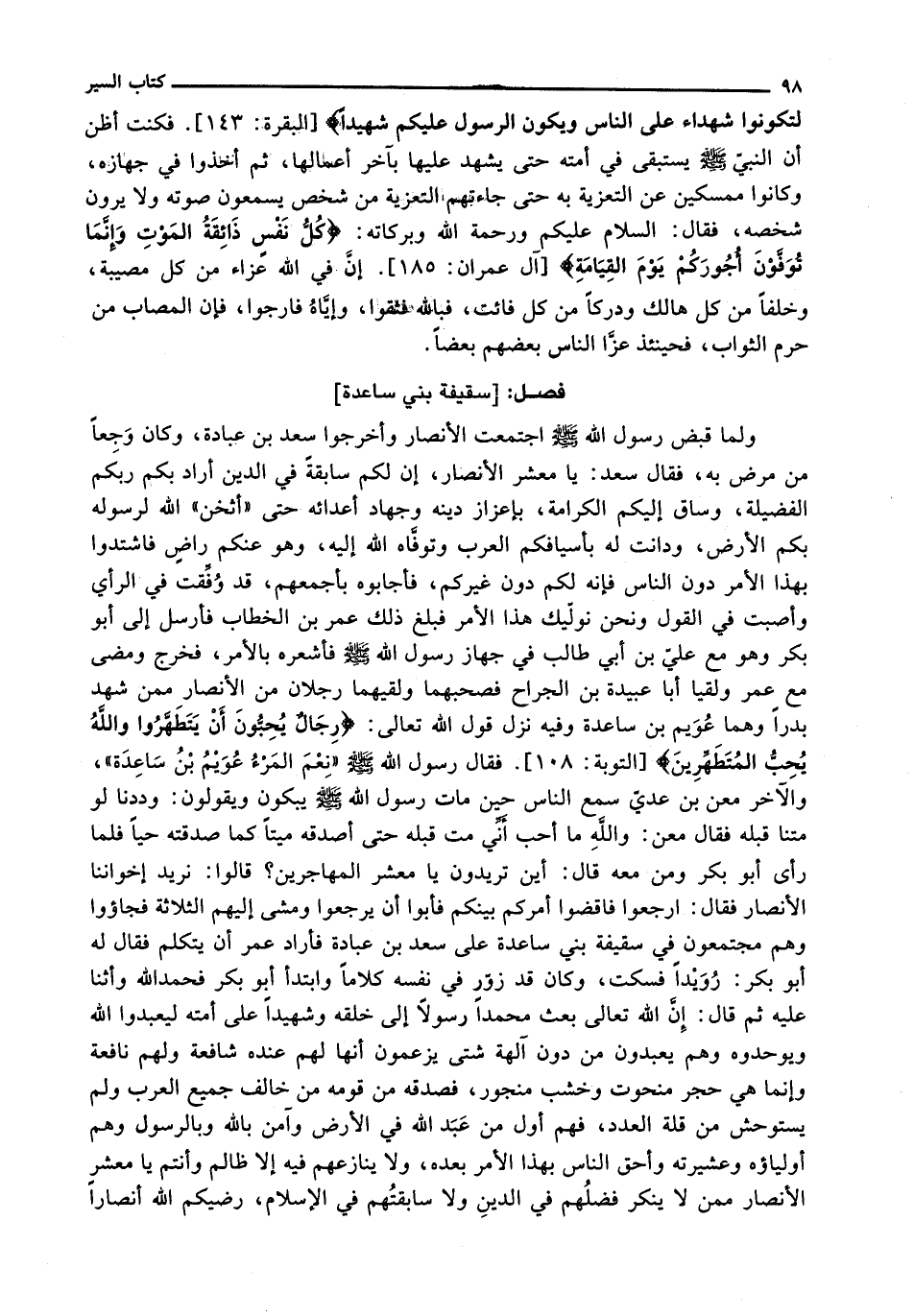 وَلَمَّا قُبِضَ رَسُولُ اللَّهِ - صَلَّى اللَّهُ عَلَيْهِ وَسَلَّم َ - اجْتَمَعَتِ الْأَنْصَارُ وَأَخْرَجُوا سَعْدَ بْنَ عُبَادَةَ، وَكَانَ وَجِعًا مِنْ مَرَضٍ بِهِ، فَقَالَ سَعْدٌ: يَا مَعْشَرَ الْأَنْصَارِ، إِنَّ لَكُمْ سَابِقَةً فِي الدِّينِ أَرَادَ بِكُمْ رَبُّكُمُ الْفَضِيلَةَ، وَسَاقَ إِلَيْكُمُ الْكَرَامَةَ، بِإِعْزَازِ دِينِهِ وَجِهَادِ أَعْدَائِهِ حَتَّى " أَثْخَنَ " اللَّهُ لِرَسُولِهِ بِكُمُ الْأَرْضَ، وَدَانَتْ لَهُ بِأَسْيَافِكُمُ الْعَرَبُ وَتَوَفَّاهُ اللَّهُ إِلَيْهِ، وَهُوَ عَنْكُمْ رَاضٍ فَاشْتَدُّوا بِهَذَا الْأَمْرِ دُونَ النَّاسِ فَإِنَّهُ لَكُمْ دُونَ غَيْرِكُمْ، فَأَجَابُوهُ بِأَجْمَعِهِمْ، قَدْ وُفِّقْتَ فِي الرَّأْيِ وَأَصَبْتَ فِي الْقَوْلِ وَنَحْنُ نُوَلِّيكَ هَذَا الْأَمْرَ فَبَلَغَ ذَلِكَ عُمَرَ بْنَ الْخَطَّابِ فَأَرْسَلَ إِلَى أبو بَكْرٍ وَهُوَ مَعَ عَلِيِّ بْنِ أَبِي طَالِبٍ فِي جَهَازِ رَسُولِ اللَّهِ - صَلَّى اللَّهُ عَلَيْهِ وَسَلَّم َ - فَأَشْعَرَهُ بِالْأَمْرِ، فَخَرَجَ وَمَضَى مَعَ عُمَرَ وَلَقِيَا أَبَا عُبَيْدَةَ بْنَ الْجَرَّاحِ فَصَحِبَهُمَا وَلَقِيَهُمَا رَجُلَانِ مِنَ الْأَنْصَارِ مِمَّنْ شَهِدَ بَدْرًا وَهُمَا عُوَيْمُ بْنُ سَاعِدَةَ وَفِيهِ نَزَلَ قَوْلُ اللَّهِ تَعَالَى {رجال يحبون أن يتطهروا والله يحب المتطهرين} [التوبة: 108] فَقَالَ رَسُولُ اللَّهِ - صَلَّى اللَّهُ عَلَيْهِ وَسَلَّم َ - " نِعْمَ الْمَرْءُ عُوَيْمُ بْنُ سَاعِدَةَ " وَالْآخَرُ مَعْنُ بْنُ عَدِيٍّ سَمِعَ النَّاسَ حِينَ مَاتَ رَسُولُ اللَّهِ - صَلَّى اللَّهُ عَلَيْهِ وَسَلَّم َ - يَبْكُونَ وَيَقُولُونَ: وَدِدْنَا لَوْ مُتْنَا قَبْلَهُ فَقَالَ مَعْنٌ: وَاللَّهِ مَا أُحِبُّ أَنِّي مِتُّ قَبْلَهُ حَتَّى أُصَدِّقَهُ مَيِّتًا كَمَا صَدَّقْتُهُ حَيًّا فَلَمَّا رأى أبو بَكْرٍ وَمَنْ مَعَهُ قَالَ: أَيْنَ تُرِيدُونَ يَا معشر المهاجرين؟ فقالوا: نُرِيدُ إِخْوَانَنَا الْأَنْصَارَ فَقَالَ: ارْجِعُوا فَاقْضُوا أَمْرَكُمْ بَيْنَكُمْ فَأَبَوْا أَنْ يَرْجِعُوا وَمَشَى إِلَيْهِمُ الثَّلَاثَةُ فجاؤوا وَهُمْ مُجْتَمِعُونَ فِي سَقِيفَةِ بَنِي سَاعِدَةَ عَلَى سَعْدِ بْنِ عُبَادَةَ فَأَرَادَ عُمَرُ أَنْ يَتَكَلَّمَ فَقَالَ لَهُ أَبُو بَكْرٍ: رُوَيْدًا فَسَكَتَ، وَكَانَ قَدْ زَوَّرَ فِي نَفْسِهِ كَلَامًا وَابْتَدَأَ أَبُو بكر فحمد الله واثنا عَلَيْهِ ثُمَّ قَالَ: إِنَّ اللَّهَ تَعَالَى بَعَثَ مُحَمَّدًا رَسُولًا إِلَى خَلْقِهِ وَشَهِيدًا عَلَى أُمَّتِهِ ليعبدوا الله ويوحدوه وهم يعبدون من دون آلِهَةً شَتَّى يَزْعُمُونَ أَنَّهَا لَهُمْ عِنْدَهُ شَافِعَةٌ وَلَهُمْ نَافِعَةٌ وَإِنَّمَا هِيَ حَجَرٌ مَنْحُوتٌ وَخَشَبٌ مَنْجُورٌ، فَصَدَّقَهُ مِنْ قَوْمِهِ مَنْ خَالَفَ جَمِيعَ الْعَرَبِ وَلَمْ يَسْتَوْحِشْ مِنْ قِلَّةِ الْعَدَدِ، فَهُمْ أَوَّلُ مَنْ عَبَدَ اللَّهَ فِي الْأَرْضِ وَآمَنَ بِاللَّهِ وَبِالرَّسُولِ وَهُمْ أَوْلِيَاؤُهُ وَعَشِيرَتُهُ وَأَحَقُّ النَّاسِ بِهَذَا الْأَمْرِ بَعْدَهُ، وَلَا يُنَازِعُهُمْ فِيهِ إِلَّا ظَالِمٌ وَأَنْتُمْ يَا مَعْشَرَ الْأَنْصَارِ مِمَّنْ لَا يُنْكَرُ فَضْلُهُمْ فِي الدِّينِ وَلَا سَابِقَتُهُمْ فِي الْإِسْلَامِ، رَضِيَكُمُ اللَّهُ أَنْصَارًا