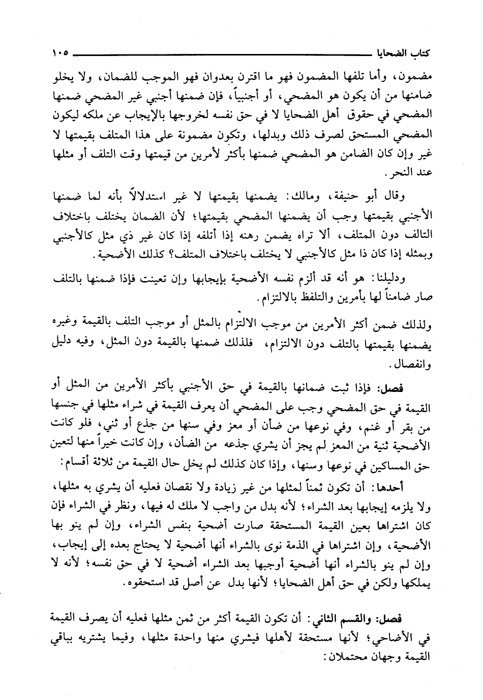 فَإِذَا ثَبَتَ ضَمَانُهَا بِالْقِيمَةِ فِي حَقِّ الْأَجْنَبِيِّ بِأَكْثَرِ الْأَمْرَيْنِ مِنَ الْمِثْلِ أَوِ الْقِيمَةِ فِي حَقِّ الْمُضَحِّي وَجَبَ عَلَى الْمُضَحِّي أَنْ يَعْرِفَ الْقِيمَةَ فِي شِرَاءِ مِثْلِهَا فِي جِنْسِهَا مِنْ بَقَرٍ أَوْ غَنَمٍ، وَفِي نَوْعِهَا مِنْ ضَأْنٍ أَوْ مَعَزٍ وَفِي سِنِّهَا مِنْ جَذَعٍ أَوْ ثَنِيٍّ، فَلَوْ كَانَتِ الْأُضْحِيَّةُ ثَنِيَّةً مِنَ الْمَعْزِ لَمْ يَجُزْ أَنْ يَشْرِيَ جَذَعَة مِنَ الضَّأْنِ، وَإِنْ كَانَتْ خَيْرًا مِنْهَا لِتَعَيُّنِ حَقِّ الْمَسَاكِينِ فِي نَوْعِهَا وَسِنِّهَا، وَإِذَا كَانَ كَذَلِكَ لَمْ يَخْلُ حَالُ الْقِيمَةِ مِنْ ثَلَاثَةِ أَقْسَامٍ: