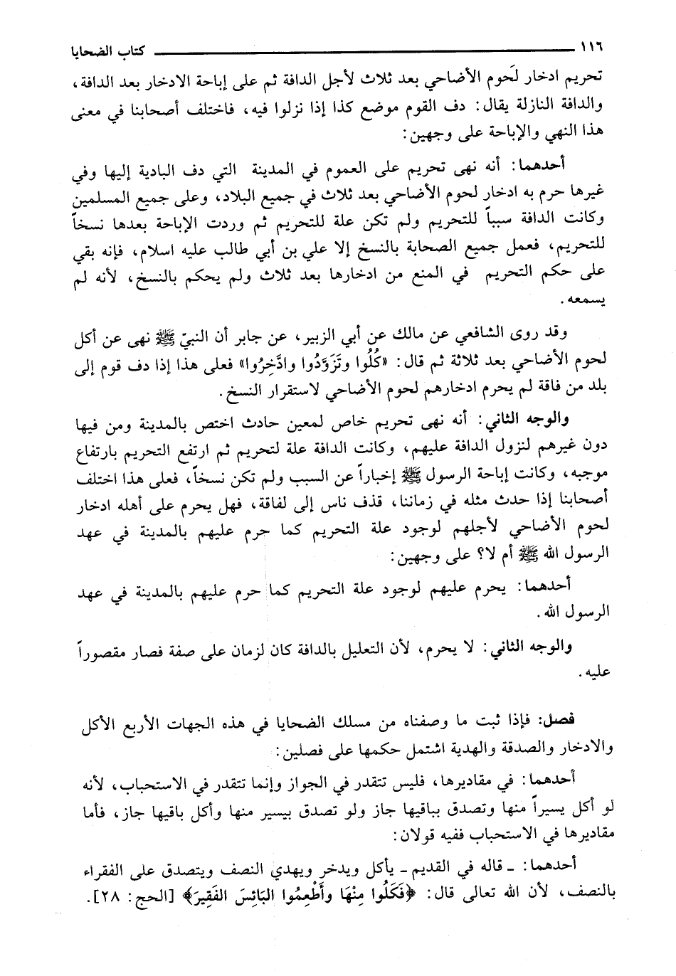 فَإِذَا ثَبَتَ مَا وَصَفْنَاهُ مِنْ مَسْلَكِ الضَّحَايَا فِي هَذِهِ الْجِهَاتِ الْأَرْبَعِ الْأَكْلِ وَالِادِّخَارِ وَالصَّدَقَةِ وَالْهَدِيَّةِ اشْتَمَلَ حُكْمُهَا عَلَى فَصْلَيْنِ: