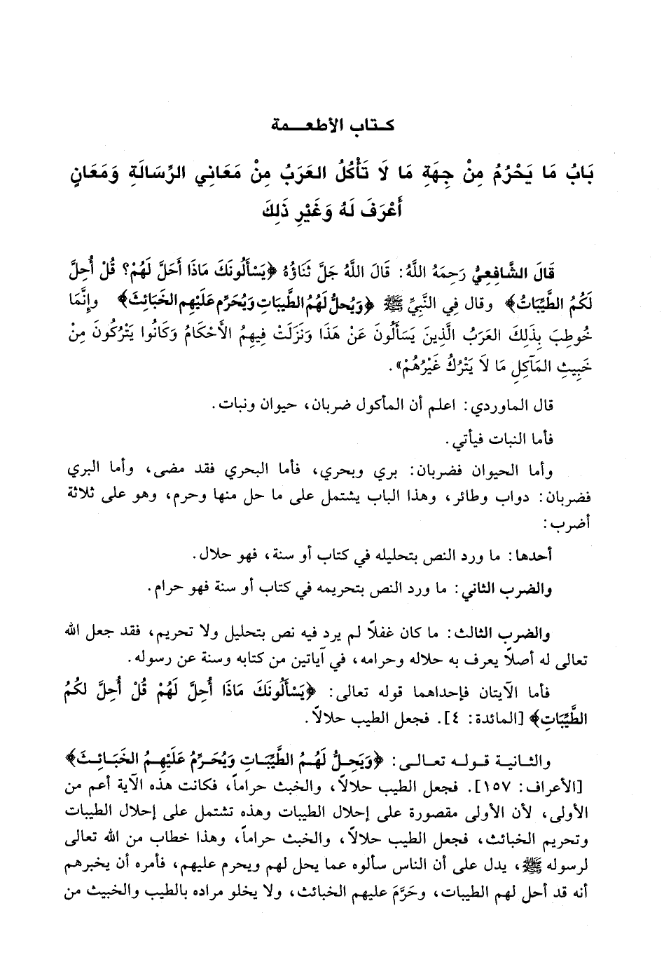قَالَ الشَّافِعِيُّ رَحِمَهُ اللَّهُ: قَالَ اللَّهُ جَلَّ ثَنَاؤُهُ {يَسْأَلُونَكَ مَاذَا أُحِلَّ لَهُمْ قُلْ أُحِلَّ لَكُمُ الطَّيِّبَاتُ} وَقَالَ فِي النَّبِيِّ - صَلَّى اللَّهُ عَلَيْهِ وَسَلَّم َ - {وَيُحِلُّ لَهُمُ الطَّيِّبَاتِ وَيُحَرِّمُ عَلَيْهِمْ الخَبَائِثَ} وَإِنَّمَا خُوطِبَ بِذَلِكَ الْعَرَبُ الَّذِينَ يَسْأَلُونَ عَنْ هَذَا وَنَزَلَتْ فِيهِمُ الْأَحْكَامُ وَكَانُوا يَتْرُكُونَ مِنْ خَبِيثِ الْمَآكِلِ مَا لَا يَتْرُكُ غَيْرُهُمْ ".