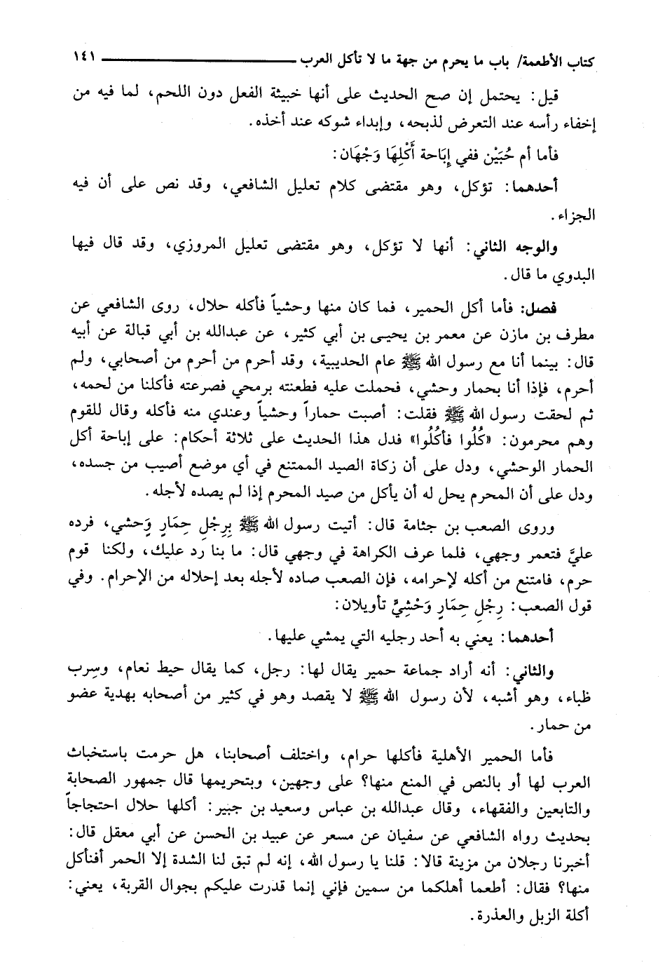 فَأَمَّا أَكْلُ الْحَمِيرِ، فَمَا كَانَ مِنْهَا وَحَشِيًّا فَأَكْلُهُ حَلَالٌ، رَوَى الشَّافِعِيُّ عَنْ مُطَرِّفِ بْنِ مَازِنٍ عَنْ مَعْمَرِ بْنِ يَحْيَى بْنِ أَبِي كَثِيرٍ، عَنْ عَبْدِ اللَّهِ بن أبي قبالة عَنْ أَبِيهِ قَالَ: بَيْنَمَا أَنَا مَعَ رَسُولِ اللَّهِ - صَلَّى اللَّهُ عَلَيْهِ وَسَلَّم َ - عَامَ الْحُدَيْبِيَّةِ، وَقَدْ أَحْرَمُ مَنْ أَحْرَمَ مِنْ أَصْحَابِي، وَلَمْ أُحْرِمْ، فَإِذَا أَنَا بِحِمَارٍ وَحْشِيٍّ، فَحَمَلْتُ عَلَيْهِ فَطَعَنْتُهُ بِرُمْحِي فَصَرَعْتُهُ فَأَكَلْنَا مِنْ لَحْمِهِ، ثُمَّ لَحِقْتُ رَسُولَ اللَّهِ - صَلَّى اللَّهُ عَلَيْهِ وَسَلَّم َ - فَقُلْتُ: أَصَبْتُ حِمَارًا وَحَشِيًّا وَعِنْدِي مِنْهُ فَأَكَلَهُ وَقَالَ لِلْقَوْمِ وَهُمْ مُحْرِمُونَ: " كُلُوا فَأَكَلُوا " فَدَلَّ هَذَا الْحَدِيثُ عَلَى ثَلَاثَةِ أَحْكَامٍ: عَلَى إِبَاحَةِ أَكْلِ الْحِمَارِ الْوَحْشِيِّ، وَدَلَّ عَلَى أَنَّ زَكَاةَ الصَّيْدِ الْمُمْتَنِعِ فِي أَيِّ مَوْضِعٍ أُصِيبَ مِنْ جَسَدِهِ، وَدَلَّ عَلَى أَنَّ الْمُحْرِمَ يَحِلُّ لَهُ أَنْ يَأْكُلَ مِنْ صَيْدِ الْمُحْرِمِ إِذَا لَمْ يَصِدْهُ لِأَجْلِهِ.