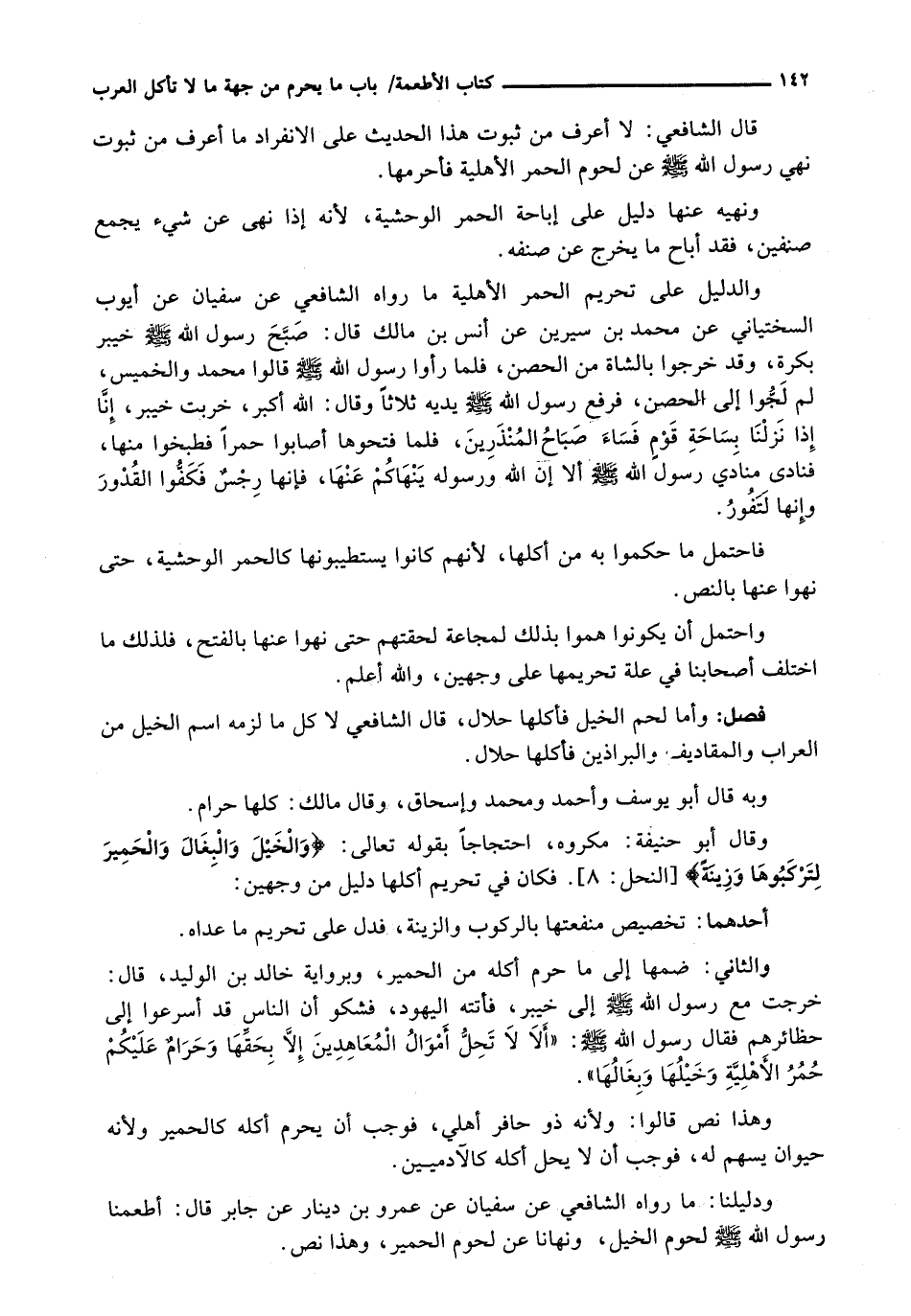 وَالدَّلِيلُ عَلَى تَحْرِيمِ الْحُمُرِ الْأَهْلِيَّةِ مَا رَوَاهُ الشَّافِعِيُّ عَنْ سُفْيَانَ عَنْ أَيُّوبَ السِّخْتِيَانِيِّ عَنْ مُحَمَّدِ بْنِ سِيرِينَ عَنْ أَنَسِ بْنِ مَالِكٍ قَالَ: صَبَّحَ رَسُولُ الله - صَلَّى اللَّهُ عَلَيْهِ وَسَلَّم َ - خَيْبَرَ بُكْرَةً، وَقَدْ خَرَجُوا بِالشَّاةِ مِنَ الْحِصْنِ، فَلَمَّا رَأَوْا رَسُولَ اللَّهِ - صَلَّى اللَّهُ عَلَيْهِ وَسَلَّم َ - قالوا محمد والخميس، لم لَجُّوا إِلَى الْحِصْنِ، فَرَفَعَ رَسُولُ اللَّهِ - صَلَّى اللَّهُ عَلَيْهِ وَسَلَّم َ - يَدَيْهِ ثَلَاثًا وَقَالَ: اللَّهُ أَكْبَرُ، خَرِبَتْ خَيْبَرُ، إِنَّا إِذَا نَزَلْنَا بِسَاحَةِ قومٍ فَسَاءَ صَبَاحُ الْمُنْذَرِينَ، فَلَمَّا فَتَحُوهَا أَصَابُوا حُمُرًا فَطَبَخُوا مِنْهَا، فَنَادَى مُنَادِيَ رَسُولِ اللَّهِ - صَلَّى اللَّهُ عَلَيْهِ وَسَلَّم َ - أَلَا إِنَّ اللَّهَ وَرَسُولَهُ يَنْهَاكُمْ عَنْهَا، فَإِنَّهَا رجسٌ فَكَفُّوا الْقُدُورَ وَإِنَّهَا لَتَفُورُ.