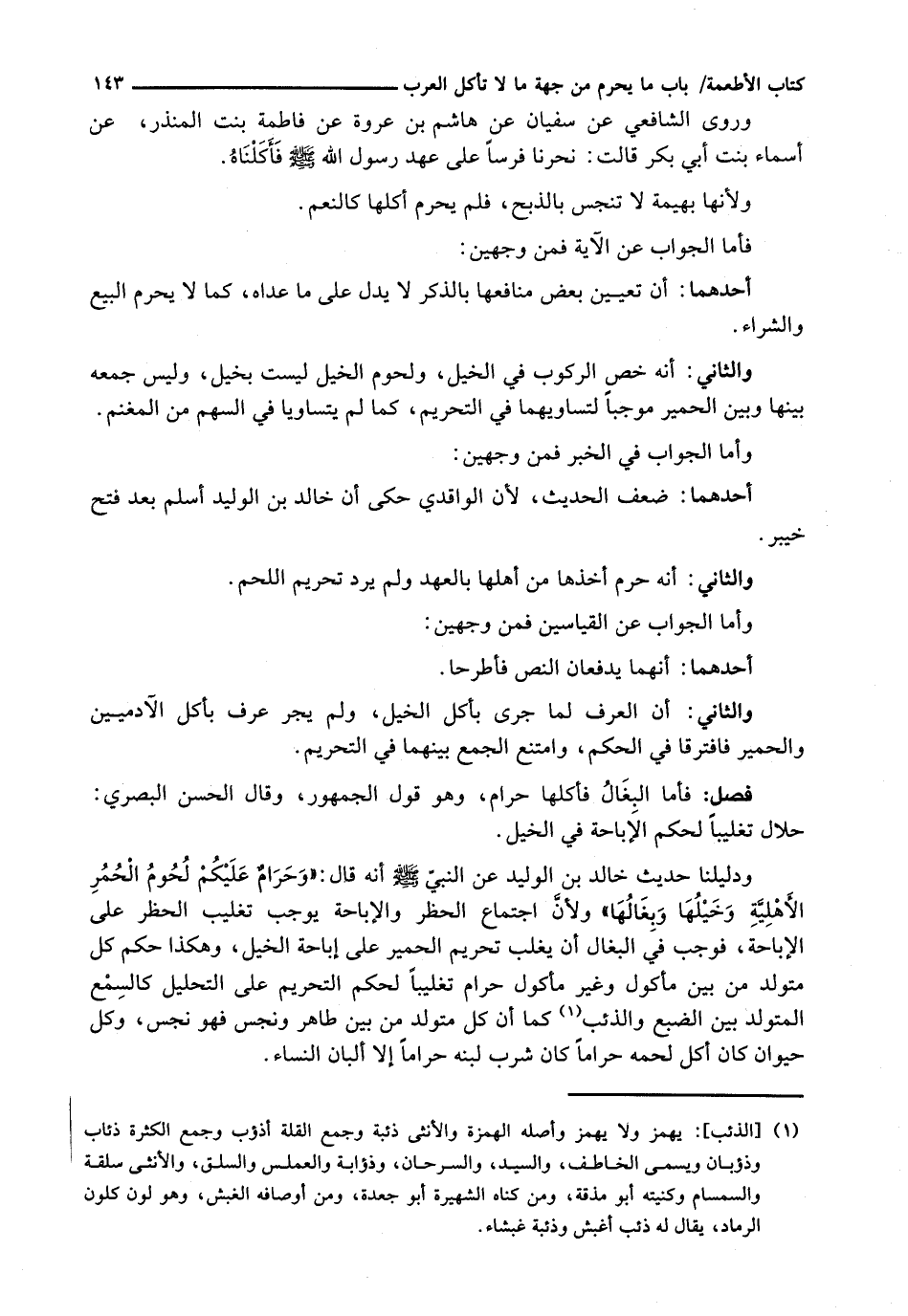 وَرَوَى الشَّافِعِيُّ عَنْ سُفْيَانَ عَنْ هَاشِمِ بْنِ عُرْوَةَ عَنْ فَاطِمَةُ بِنْتُ الْمُنْذِرِ، عَنْ أَسْمَاءَ بِنْتِ أَبِي بَكْرٍ قَالَتْ: نَحَرْنَا فَرَسًا عَلَى عَهْدِ رَسُولِ اللَّهِ - صَلَّى اللَّهُ عَلَيْهِ وَسَلَّم َ - فَأَكَلْنَاهُ.