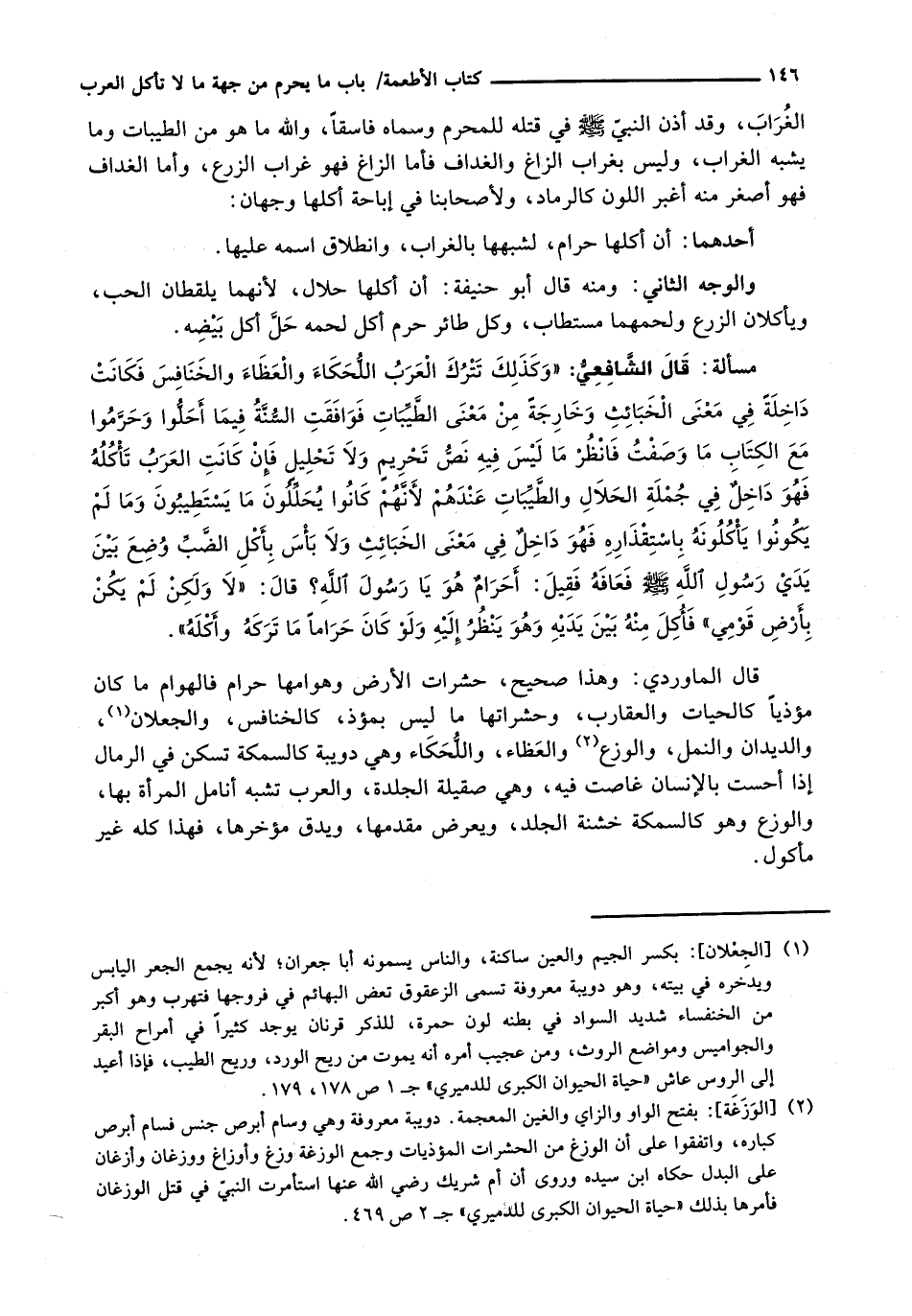 قَالَ الْمَاوَرْدِيُّ: وَهَذَا صَحِيحٌ، حَشَرَاتُ الْأَرْضِ وَهَوَامُّهَا حَرَامٌ فَالْهَوَامُّ مَا كَانَ مُؤْذِيًا كَالْحَيَّاتِ وَالْعَقَارِبِ، وَحَشَرَاتُهَا مَا لَيْسَ بِمُؤْذٍ، كَالْخَنَافِسِ، وَالْجُعْلَانِ، وَالدِّيدَانِ والنمل، والوزع وَالْعِظَاءِ، وَاللُّحَكَاءِ وَهِيَ دُوَيْبَةٌ كَالسَّمَكَةِ تَسْكُنُ فِي الرِّمَالِ إِذَا أَحَسَّتْ بِالْإِنْسَانِ غَاصَتْ فِيهِ، وَهِيَ صَقِيلَةُ الْجِلْدَةِ، وَالْعَرَبُ تُشَبِّهُ أَنَامِلَ الْمَرْأَةِ بِهَا، والوزع وَهُوَ كَالسَّمَكَةِ خَشِنَةُ الْجِلْدِ، وَيَعْرُضُ مُقَدَّمُهَا، وَيَدُقُّ مُؤَخَّرُهَا، فَهَذَا كُلُّهُ غَيْرُ مَأْكُولٍ.