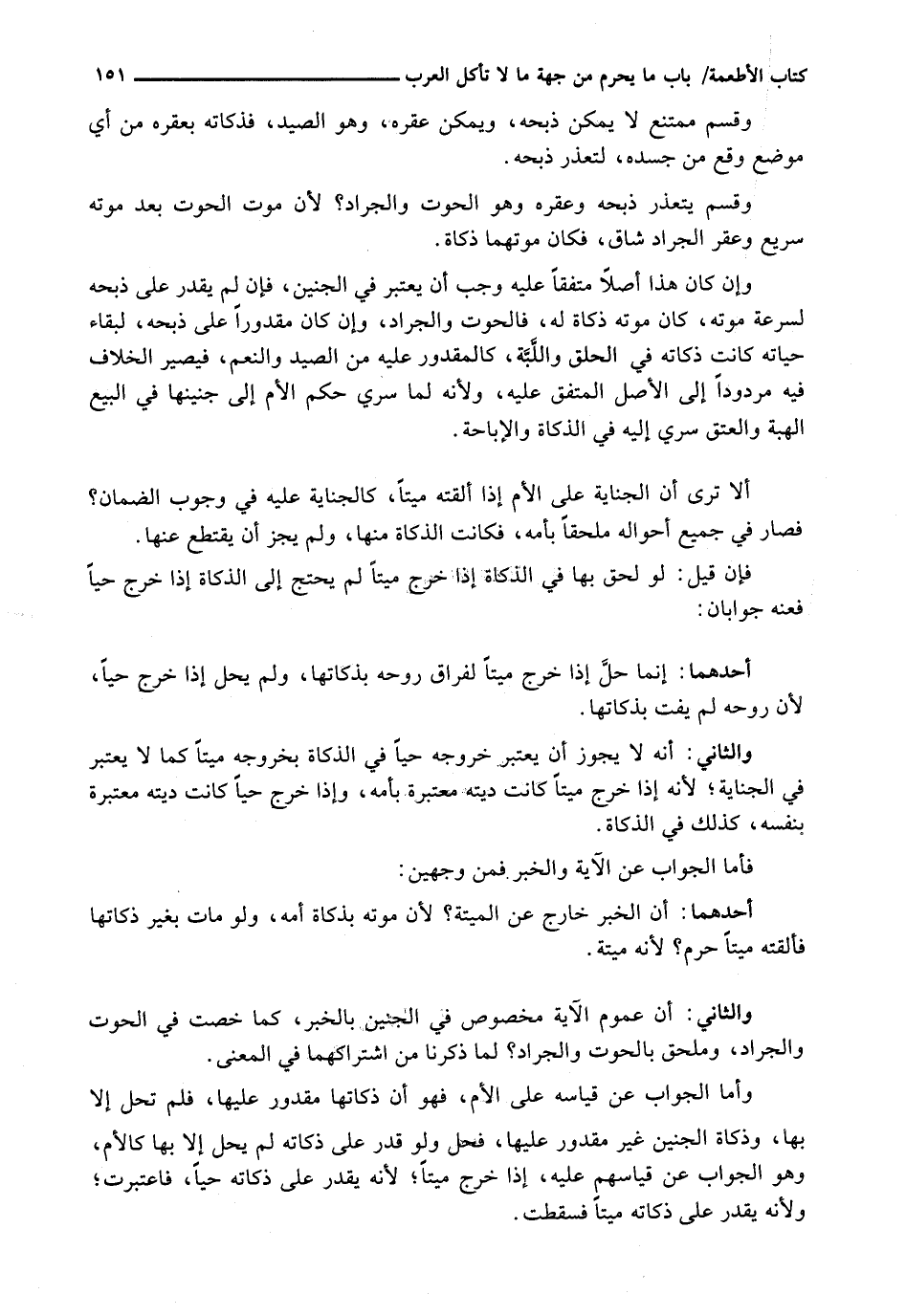 وَأَمَّا الْجَوَابُ عَنْ قِيَاسِهِ عَلَى الْأُمِّ، فَهُوَ أَنَّ ذَكَاتَهَا مَقْدُورٌ عَلَيْهَا، فَلَمْ تَحِلَّ إِلَّا بِهَا، وَذَكَاةُ الْجَنِينِ غَيْرُ مَقْدُورٍ عَلَيْهَا، فَحَلَّ وَلَوْ قَدَرَ عَلَى ذَكَاتِهِ لَمْ يَحِلَّ إِلَّا بِهَا كَالْأُمِّ، وَهُوَ الْجَوَابُ عَنْ قِيَاسِهِمْ عَلَيْهِ، إِذَا خَرَجَ مَيْتًا؛ لِأَنَّهُ يُقْدَرُ عَلَى ذَكَاتِهِ حَيًّا، فَاعْتُبِرَتْ؛ وَلِأَنَّهُ يُقَدَرُ عَلَى ذَكَاتِهِ ميتاً فسقطت.