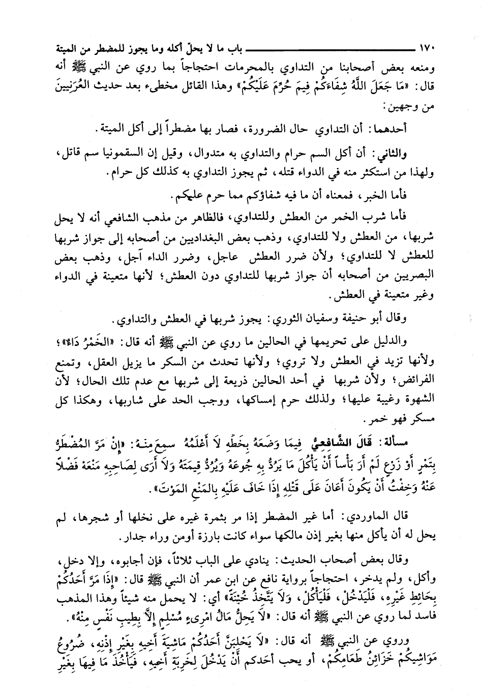 وَمَنَعَهُ بَعْضُ أَصْحَابِنَا من التَّدَاوِي بِالْمُحَرَّمَاتِ احْتِجَاجًا بِمَا رُوِيَ عَنِ النَّبِيِّ - صَلَّى اللَّهُ عَلَيْهِ وَسَلَّم َ - أَنَّهُ قَالَ: " مَا جَعَلَ اللَّهُ شِفَاءَكُمْ فِيمَ حَرَّمَ عَلَيْكُمْ " وَهَذَا الْقَائِلُ مُخْطِئٌ بَعْدَ حَدِيثِ العرنيين من وجهين: