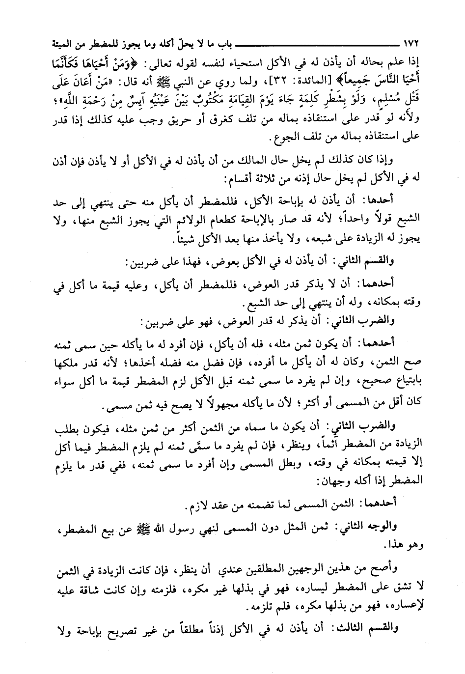 إِذَا عَلِمَ بِحَالِهِ أَنْ يَأْذَنَ لَهُ فِي الْأَكْلِ اسْتِحْيَاءً لِنَفْسِهِ لِقَوْلِهِ تَعَالَى: {وَمَنْ أحْيَاهَا فَكَأَنّمَا أَحْيَا النَّاسَ جَمِيعاً) {المائدة: 32) ، وَلِمَا رُوِيَ عَنِ النَّبِيِّ - صَلَّى اللَّهُ عَلَيْهِ وَسَلَّم َ - أَنَّهُ قَالَ: " مَنْ أَعَانَ عَلَى قَتْلِ مسلمٍ، وَلَوْ بِشَطْرِ كلمةٍِ جَاءَ يَوْمَ الْقِيَامَةِ مَكْتُوبٌ بَيْنَ عَيْنَيْهِ آيسٌ مِنْ رَحْمَةِ اللَّهِ "؛ وَلِأَنَّهُ لَوْ قَدَرَ عَلَى اسْتِنْقَاذِهِ بِمَالِهِ مِنْ تَلَفٍ كَغَرَقٍ أَوْ حَرِيقٍ وَجَبَ عَلَيْهِ كَذَلِكَ إِذَا قَدَرَ عَلَى اسْتِنْقَاذِهِ بِمَالِهِ مِنْ تَلَفِ الْجُوعِ.