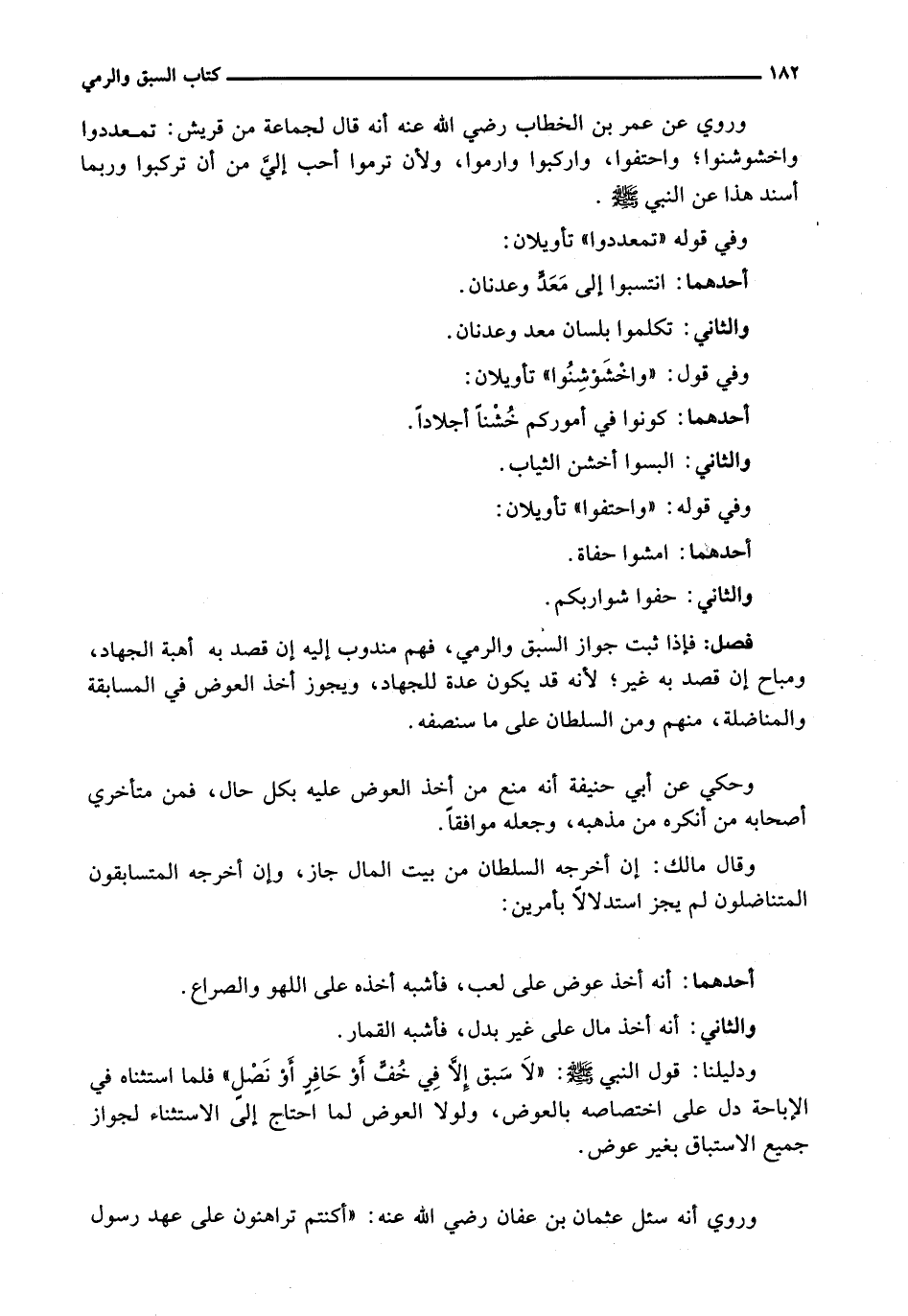 فَإِذَا ثَبَتَ جَوَازُ السَّبْقِ وَالرَّمْيِ، فهم مَنْدُوبٌ إِلَيْهِ إِنْ قُصِدَ بِهِ أُهْبَةُ الْجِهَادِ، ومباح إن قصد به غير؛ لِأَنَّهُ قَدْ يَكُونُ عُدَّةً لِلْجِهَادِ، وَيَجُوزُ أَخْذُ الْعِوَضِ فِي الْمُسَابَقَةِ وَالْمُنَاضَلَةِ، مِنْهُمْ وَمِنَ السُّلْطَانِ عَلَى مَا سَنَصِفُهُ.