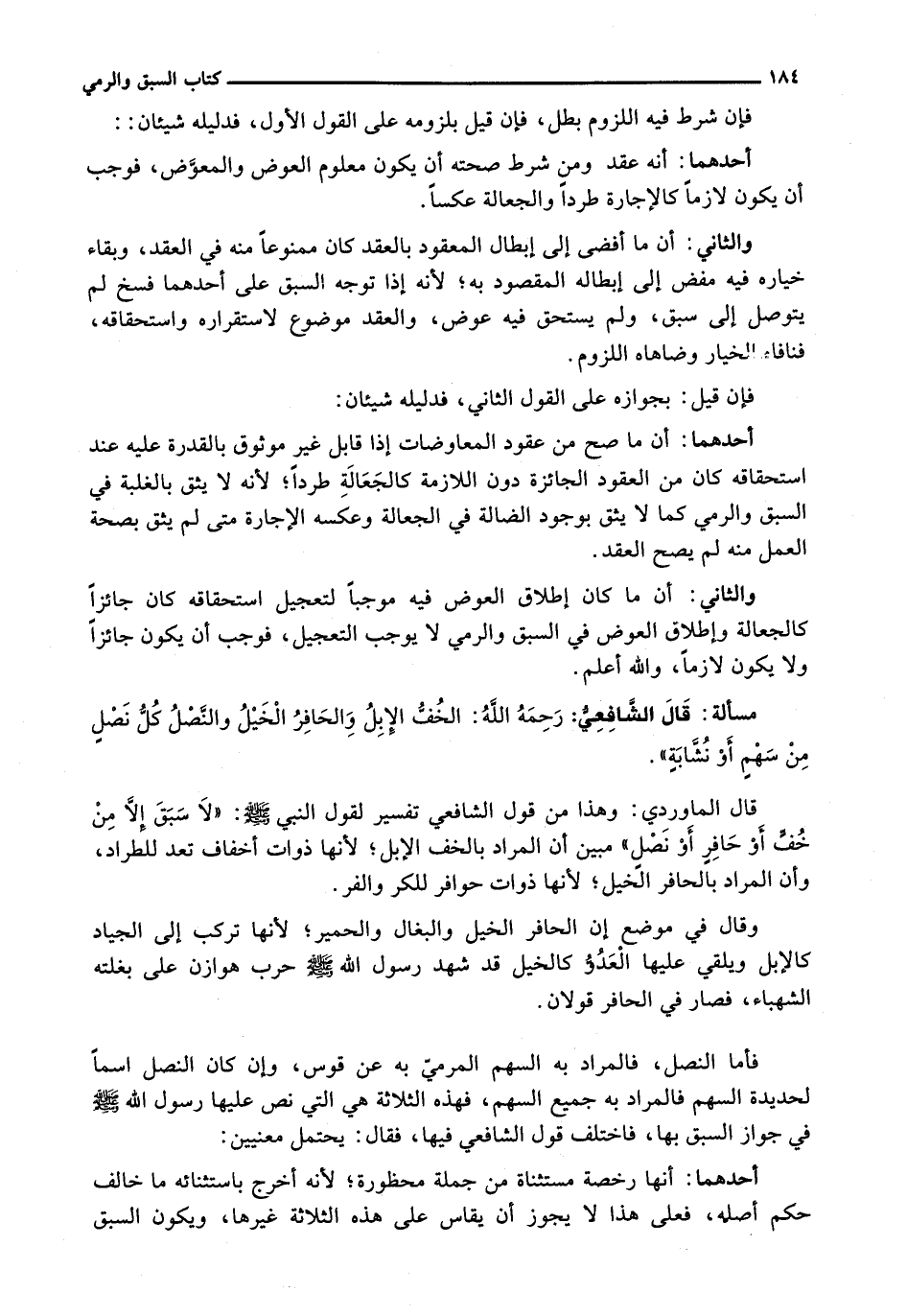 قَالَ الْمَاوَرْدِيُّ: وَهَذَا مِنْ قَوْلِ الشَّافِعِيِّ تَفْسِيرٌ لِقَوْلِ النَّبِيِّ - صَلَّى اللَّهُ عَلَيْهِ وَسَلَّم َ -: " لَا سَبْقَ إِلَّا مِنْ خفٍّ أَوْ حافرٍ أَوْ نصلٍ " مُبَيِّنٌ أَنَّ الْمُرَادَ بِالْخُفِّ الْإِبِلُ، لِأَنَّهَا ذَوَاتُ أَخْفَافٍ تُعَدُّ لِلطِّرَادِ، وَأَنَّ الْمُرَادَ بِالْحَافِرِ الْخَيْلُ؛ لِأَنَّهَا ذَوَاتُ حَوَافِرَ لِلْكَرِّ وَالْفَرِّ.