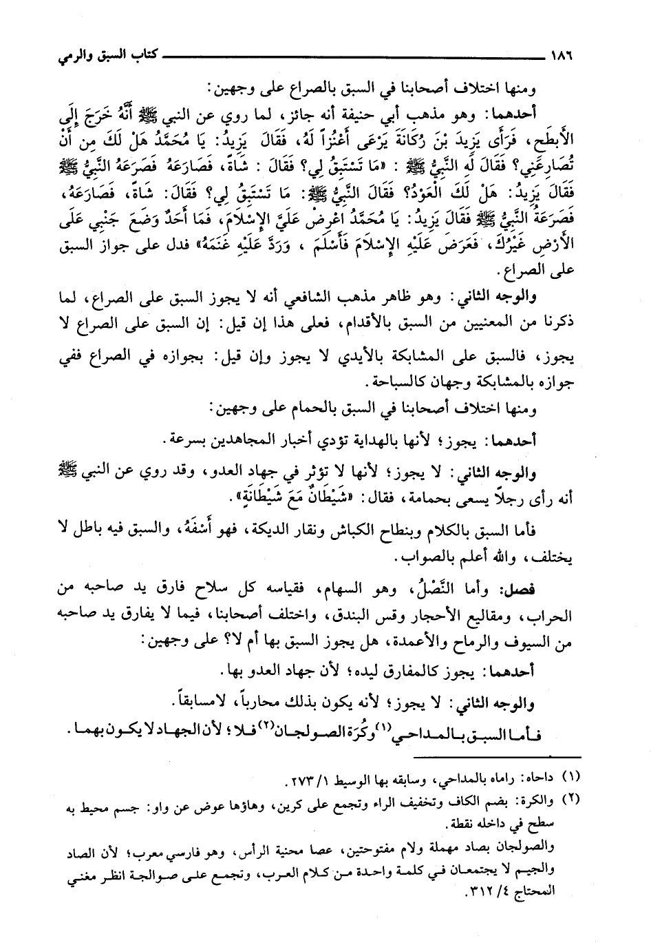 وَأَمَّا النَّصْلُ، وَهُوَ السِّهَامُ، فَقِيَاسُهُ كُلُّ سِلَاحٍ فَارَقَ يَدَ صَاحِبِهِ مِنَ الْحِرَابِ، وَمَقَالِيعِ الْأَحْجَارِ وَقَسِّ الْبُنْدُقِ، وَاخْتَلَفَ أَصْحَابُنَا، فِيمَا لَا يُفَارِقُ يَدَ صَاحِبِهِ مِنَ السُّيُوفِ وَالرِّمَاحِ وَالْأَعْمِدَةِ، هَلْ يَجُوزُ السَّبْقُ بِهَا أَمْ لَا؟ عَلَى وَجْهَيْنِ: