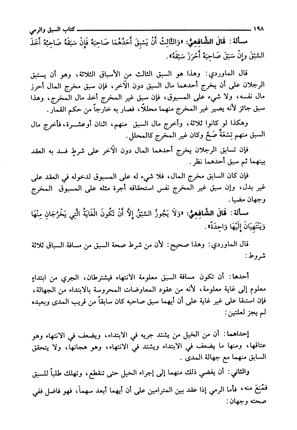 قَالَ الْمَاوَرْدِيُّ: وَهَذَا صَحِيحٌ: لِأَنَّ مِنْ شَرْطِ صِحَّةِ السَّبْقِ مِنْ مَسَافَةِ السِّبَاقِ ثَلَاثَةَ شُرُوطٍ: