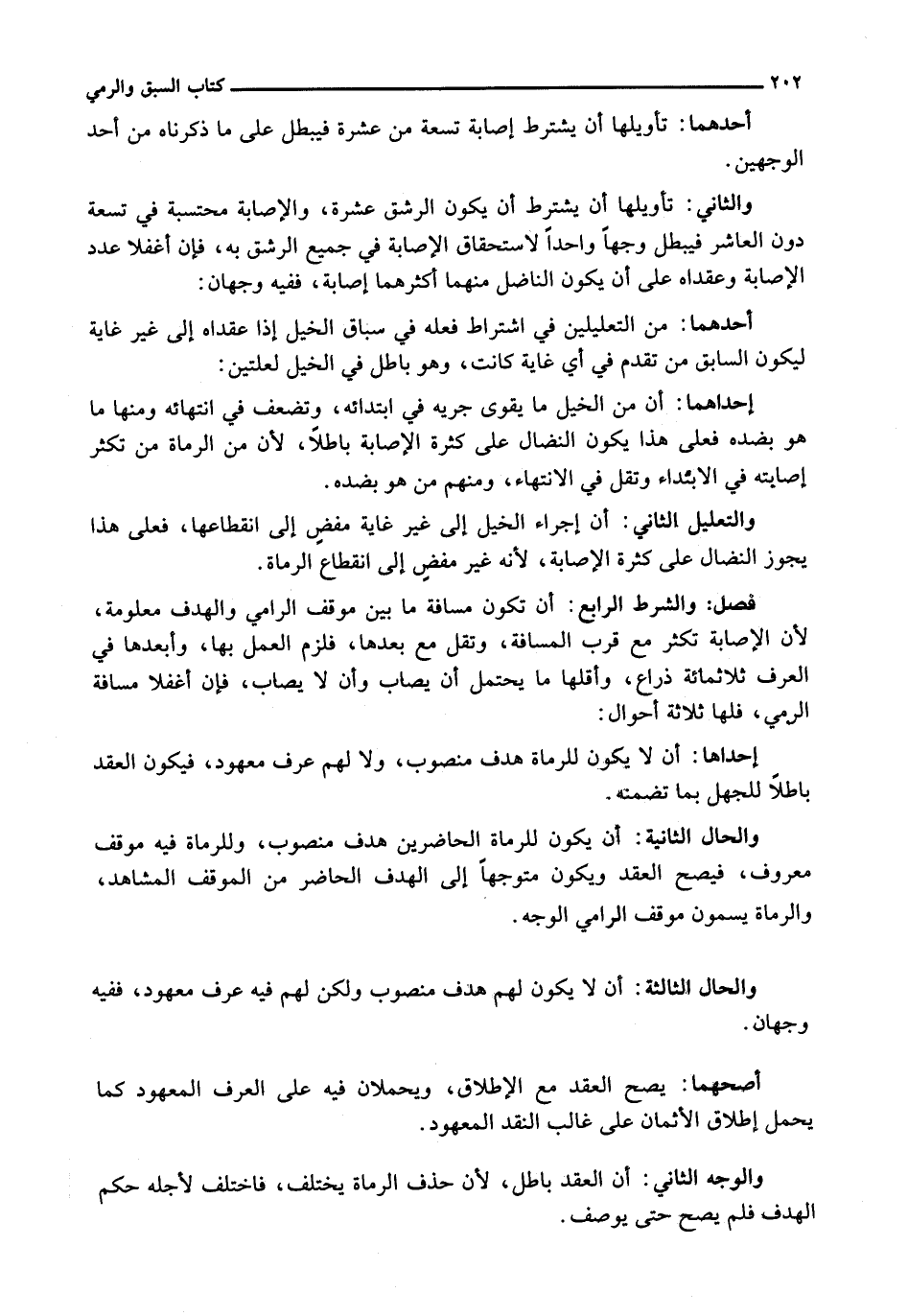 إِحْدَاهُمَا: إنَّ مِنَ الْخَيْلِ مَا يَقْوَى جَرْيُهُ فِي ابْتِدَائِهِ، وَتَضْعُفُ فِي انْتِهَائِهِ وَمِنْهَا مَا هُوَ بِضِدِّهِ فَعَلَى هَذَا يَكُونُ النِّضَالُ عَلَى كَثْرَةِ الْإِصَابَةِ بَاطِلًا، لِأَنَّ مِنَ الرُّمَاةِ مَنْ تَكْثُرُ إِصَابَتُهُ فِي الِابْتِدَاءِ وَتَقِلُّ فِي الِانْتِهَاءِ، وَمِنْهُمْ مَنْ هُوَ بِضِدِّهِ.