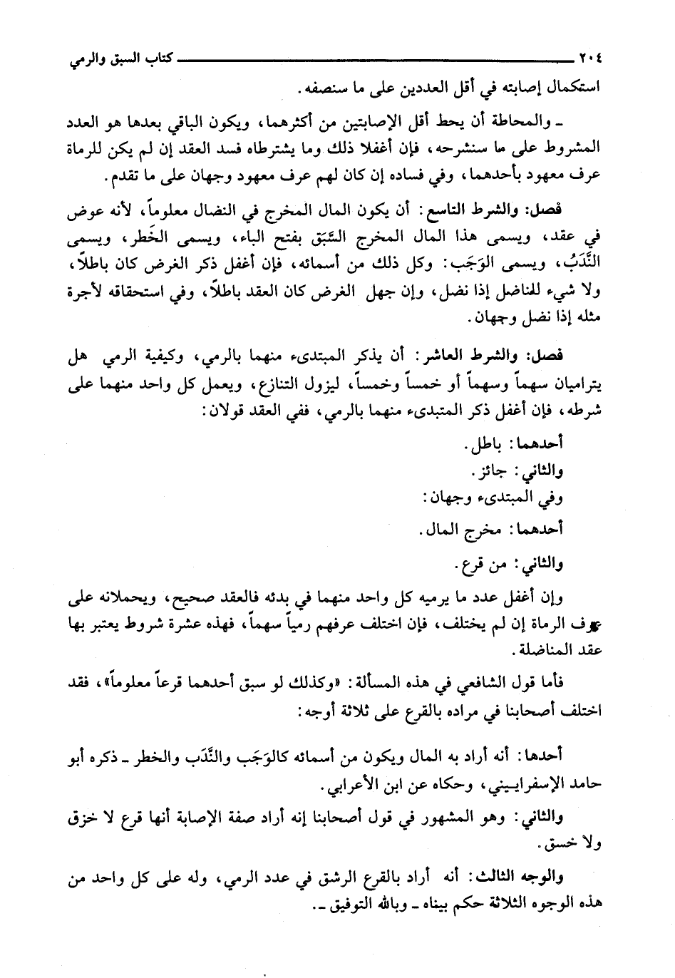 وَالشَّرْطُ الْعَاشِرُ: أَنْ يُذْكَرَ الْمُبْتَدِئُ مِنْهُمَا بِالرَّمْيِ، وَكَيْفِيَّةُ الرَّمْيِ هَلْ يَتَرَامَيَانِ سَهْمًا وَسَهْمًا أَوْ خَمْسًا وَخَمْسًا، لِيَزُولَ التَّنَازُعُ وَيَعْمَلَ كُلُّ وَاحِدٍ منهما على شرطه، فإن أغفل ذكر المبتدئ مِنْهُمَا بِالرَّمْيِ، فَفِي الْعَقْدِ قَوْلَانِ: