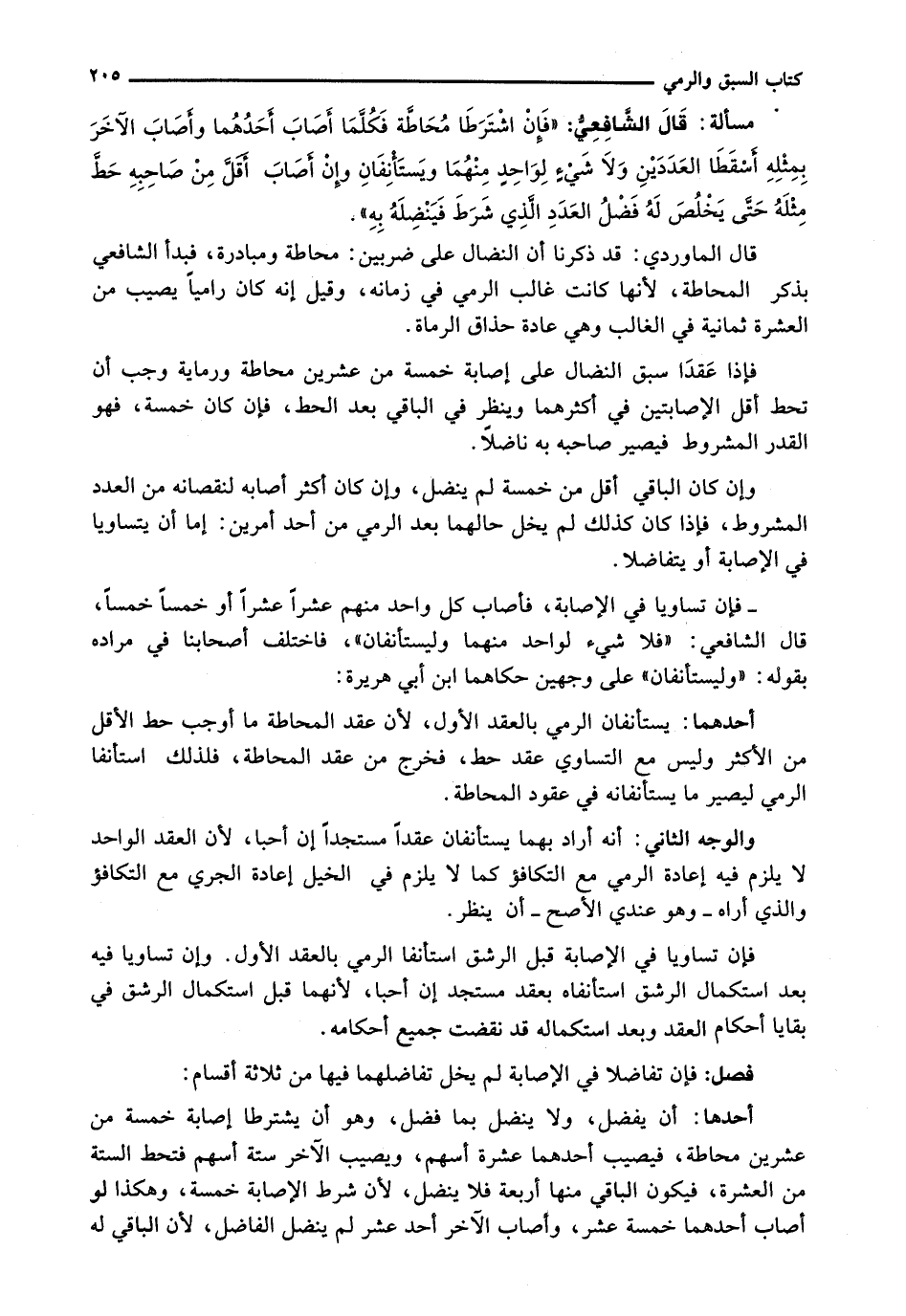 قَالَ الْمَاوَرْدِيُّ: قَدْ ذَكَرْنَا أَنَّ النِّضَالَ عَلَى ضَرْبَيْنِ: مُحَاطَّةٌ وَمُبَادَرَةٌ، فبدأ الشَّافِعِيُّ بِذِكْرِ الْمُحَاطَّةِ، لِأَنَّهَا كَانَتْ غَالِبَ الرَّمْيِ فِي زَمَانِهِ، وَقِيلَ إِنَّهُ كَانَ رَامِيًا يُصِيبُ مِنَ الْعَشَرَةِ ثَمَانِيَةً فِي الْغَالِبِ وَهِيَ عَادَةُ حُذَّاقِ الرُّمَاةِ.