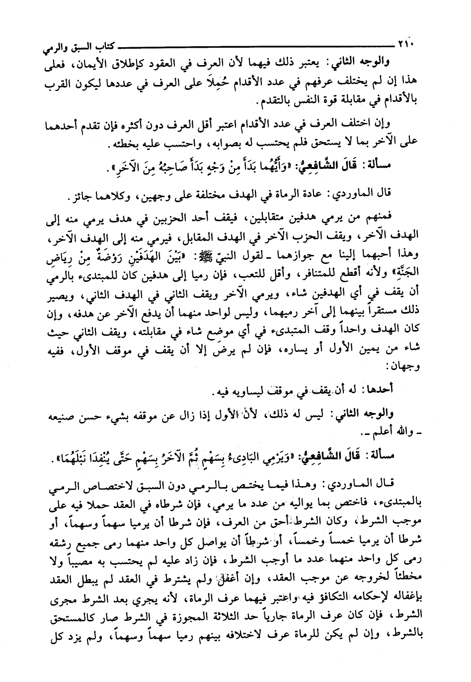 قَالَ الْمَاوَرْدِيُّ: وَهَذَا فِيمَا يَخْتَصُّ بِالرَّمْيِ دُونَ السَّبَقِ لِاخْتِصَاصِ الرَّمْيِ بِالْمُبْتَدِئِ، فَاخْتَصَّ بِمَا يُوَالِيهِ مِنْ عَدَدِ مَا يَرْمِي، فَإِنْ شَرَطَاهُ فِي الْعَقْدِ حَمَلَا فِيهِ عَلَى مُوجَبِ الشَّرْطِ، وَكَانَ الشَّرْطُ أَحَقَّ مِنَ الْعُرْفِ، فَإِنْ شَرَطَا أَنْ يَرْمِيَا سَهْمًا وَسَهْمًا، أَوْ شَرَطَا أَنْ يَرْمِيَا خَمْسًا وَخَمْسًا، أَوْ شَرَطَا أَنْ يُوَاصِلَ كُلُّ وَاحِدٍ مِنْهُمَا رَمْيَ جَمِيعِ رَشْقِهِ رَمَى كُلُّ وَاحِدٍ مِنْهُمَا عَدَدَ مَا أَوْجَبَ الشَّرْطُ، فَإِنْ زَادَ عَلَيْهِ لَمْ يُحْتَسَبْ بِهِ مُصِيبًا وَلَا مُخْطِئًا لِخُرُوجِهِ عَنْ مُوجَبِ الْعَقْدِ، وَإِنْ أُغْفِلَ وَلَمْ يُشْتَرَطْ فِي الْعَقْدِ لَمْ يَبْطُلِ الْعَقْدُ بِإِغْفَالِهِ لِإِحْكَامِهِ التَّكَافُؤَ فِيهِ وَاعْتُبِرَ فِيهِمَا عُرْفُ الرُّمَاةِ، لِأَنَّهُ يَجْرِي بَعْدَ الشَّرْطِ مَجْرَى الشَّرْطِ، فَإِنْ كَانَ عُرْفُ الرُّمَاةِ جَارِيًا حَدَّ الثَّلَاثَةِ الْمُجَوَّزَةِ فِي الشَّرْطِ صَارَ كَالْمُسْتَحَقِّ بِالشَّرْطِ، وَإِنْ لَمْ يَكُنْ لِلرُّمَاةِ عُرْفٌ لِاخْتِلَافِهِ بَيْنَهُمْ رَمَيَا سَهْمًا وَسَهْمًا، وَلَمْ يَزِدْ كُلُّ