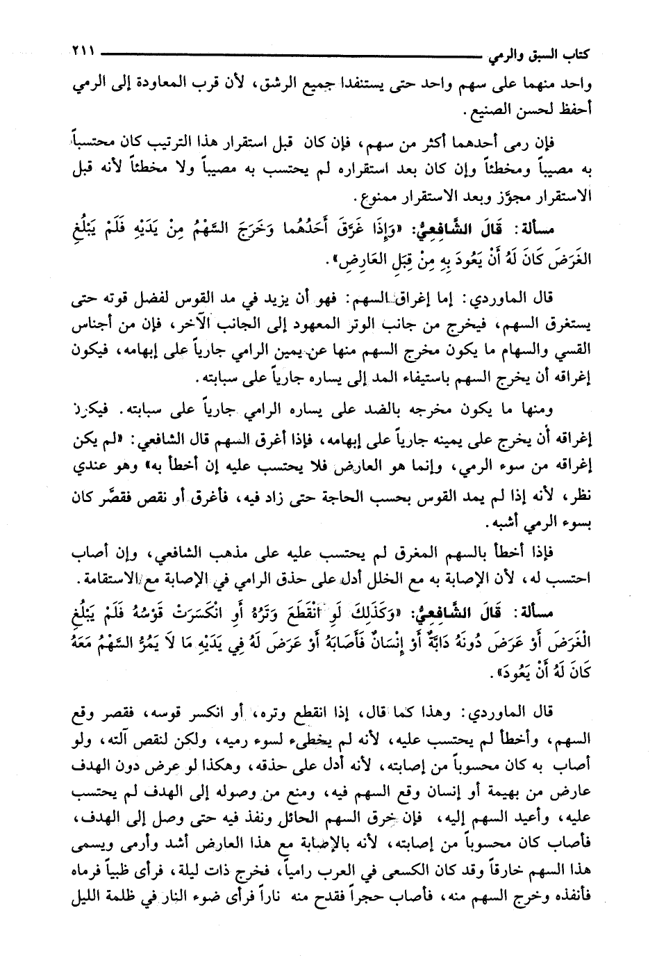 قَالَ الْمَاوَرْدِيُّ: وَهَذَا كَمَا قَالَ، إِذَا انْقَطَعَ وَتَرُهُ، أَوِ انْكَسَرَ قَوْسُهُ، فَقَصَرَ وَقْعُ السَّهْمِ، وَأَخْطَأَ لَمْ يُحْتَسَبْ عَلَيْهِ، لِأَنَّهُ لَمْ يُخْطِئْ لِسُوءِ رَمْيِهِ، وَلَكِنْ لِنَقْصِ آلَتِهِ، وَلَوْ أَصَابَ بِهِ كَانَ مَحْسُوبًا مِنْ إِصَابَتِهِ، لِأَنَّهُ أَدَلُّ عَلَى حِذْقِهِ، وَهَكَذَا لَوْ عَرَضَ دُونَ الْهَدَفِ عَارِضٌ مِنْ بَهِيمَةٍ أَوْ إِنْسَانٍ وَقَعَ السَّهْمُ فِيهِ، وَمَنَعَ مِنْ وُصُولِهِ إِلَى الْهَدَفِ لَمْ يُحْتَسَبْ عَلَيْهِ، وَأُعِيدَ السَّهْمُ إِلَيْهِ، فَإِنْ خَرَقَ السَّهْمُ الْحَائِلَ وَنَفَذَ فِيهِ حَتَّى وَصَلَ إِلَى الْهَدَفِ، فَأَصَابَ كَانَ مَحْسُوبًا مِنْ إِصَابَتِهِ، لِأَنَّهُ بِالْإِصَابَةِ مِعِ هَذَا الْعَارِضِ أَشَدُّ وَأَرْمَى وَيُسَمَّى هَذَا السَّهْمُ خَارِقًا وَقَدْ كَانَ الْكُسَعِيُّ فِي الْعَرَبِ رَامِيًا، فَخَرَجَ ذَاتَ لَيْلَةٍ، فَرَأَى ظَبْيًا فَرَمَاهُ فَأَنْفَذَهُ وَخَرَجَ السَّهْمُ مِنْهُ، فَأَصَابَ حَجَرًا فَقَدَحَ مِنْهُ نَارًا فَرَأَى ضَوْءَ النَّارِ فِي ظُلْمَةِ اللَّيْلِ