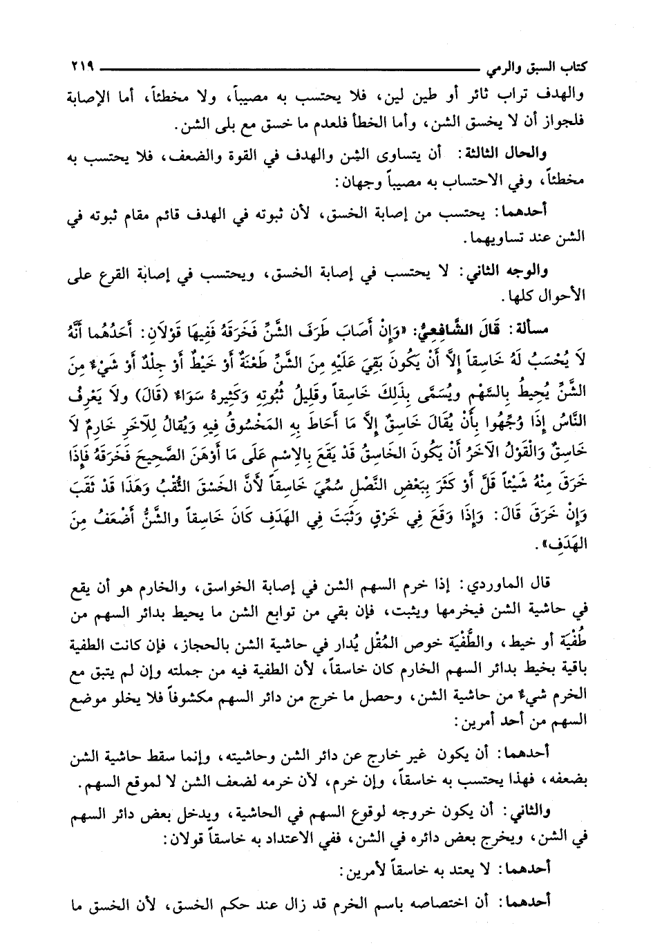 قَالَ الْمَاوَرْدِيُّ: إِذَا خَرَمَ السَّهْمُ الشَّنَّ فِي إِصَابَةِ الْخَوَاسِقِ، وَالْخَارِمُ هُوَ أَنْ يَقَعَ فِي حَاشِيَةِ الشَّنِّ فَيَخْرِمَهَا وَيَثْبُتَ، فَإِنْ بَقِيَ مِنْ تَوَابِعِ الشَّنِّ مَا يُحِيطُ بِدَائِرِ السَّهْمِ مِنْ طُفْيَةٍ أَوْ خَيْطٍ، وَالطُّفْيَةُ خُوصُ الْمُقْلِ يُدَارُ فِي حَاشِيَةِ الشَّنِّ بِالْحِجَازِ، فَإِنْ كَانَتِ الطُّفْيَةُ بَاقِيَةً بِخَيْطٍ بِدَائِرِ السَّهْمِ الْخَارِمِ كَانَ خَاسِقًا، لِأَنَّ الطُّفْيَةَ فِيهِ مِنْ جُمْلَتِهِ وَإِنْ لَمْ يَتَبَقَّ مَعَ الْخَرْمِ شيءٌ مِنْ حَاشِيَةِ الشَّنِّ، وَحَصَلَ مَا خَرَجَ مِنْ دَائِرِ السَّهْمِ مَكْشُوفًا فَلَا يَخْلُو مَوْضِعُ السَّهْمِ مِنْ أَحَدِ أَمْرَيْنِ: