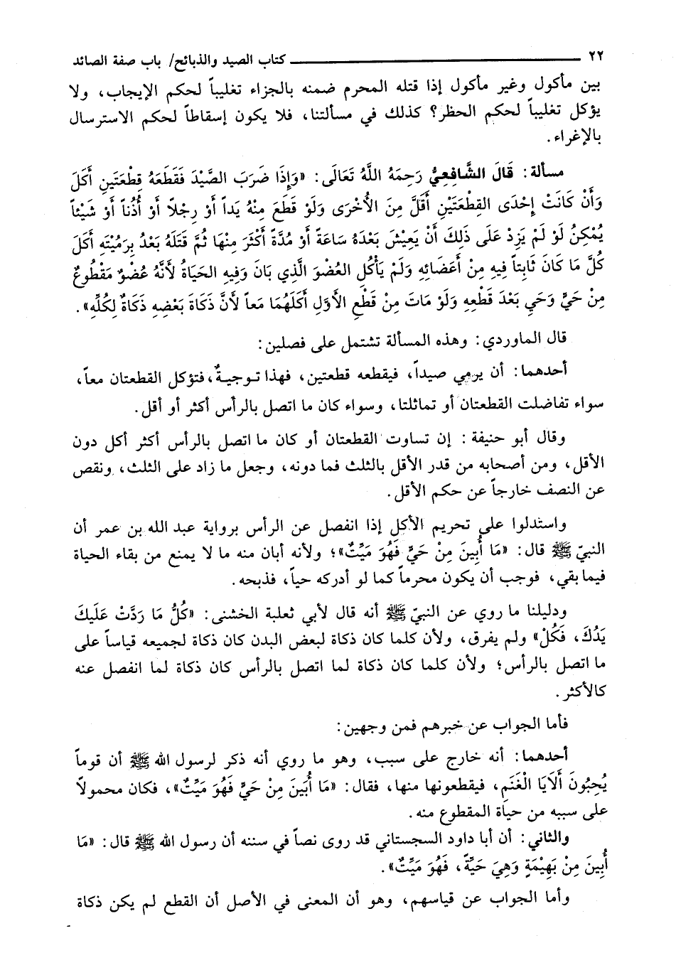 قَالَ الشافعي رحمه الله تعالى: " وَإِذَا ضَرَبَ الصَّيْدَ فَقَطَعَهُ قِطْعَتَيْنِ أَكَلَ وَإِنْ كانت إحدى القطعتين أقل من الأخرى ولو قطع منه يداً أو رجلاً أو أذناً أو شيئاً يمكن لو لم يزد على ذلك أن يعيش بعده ساعةً أو مدةً أكثر منها ثم قتله بعد برميته أكل كل ما كان ثابتاً فيه من أعضائه ولم يأكل العضو الذي بان وفيه الحياة لأنه عضوٌ مقطوعٌ من حي وحي بعد قطعه ولو مات من قطع الأول أكلهما معاً لأن ذكاة بعضه ذكاةٌ لكله ".