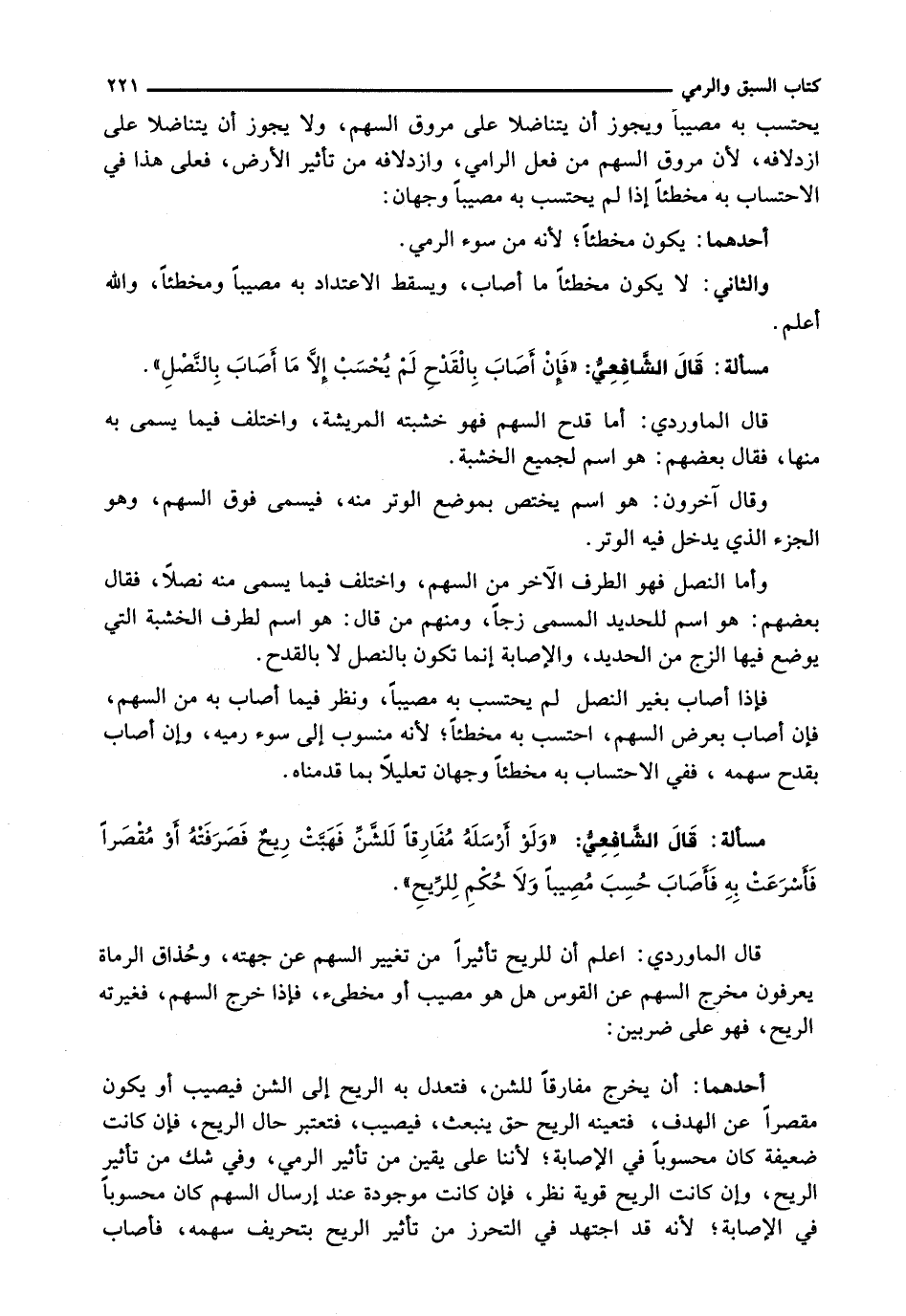 قَالَ الْمَاوَرْدِيُّ: اعْلَمْ أَنَّ لِلرِّيحِ تَأْثِيرًا مِنْ تَغْيِيرِ السَّهْمِ عَنْ جِهَتِهِ، وَحُذَّاقُ الرُّمَاةِ يَعْرِفُونَ مَخْرَجَ السَّهْمِ عَنِ الْقَوْسِ هَلْ هُوَ مُصِيبٌ أَوْ مُخْطِئٌ، فَإِذَا خَرَجَ السَّهْمُ، فَغَيَّرَتْهُ الرِّيحُ، فَهُوَ عَلَى ضَرْبَيْنِ: