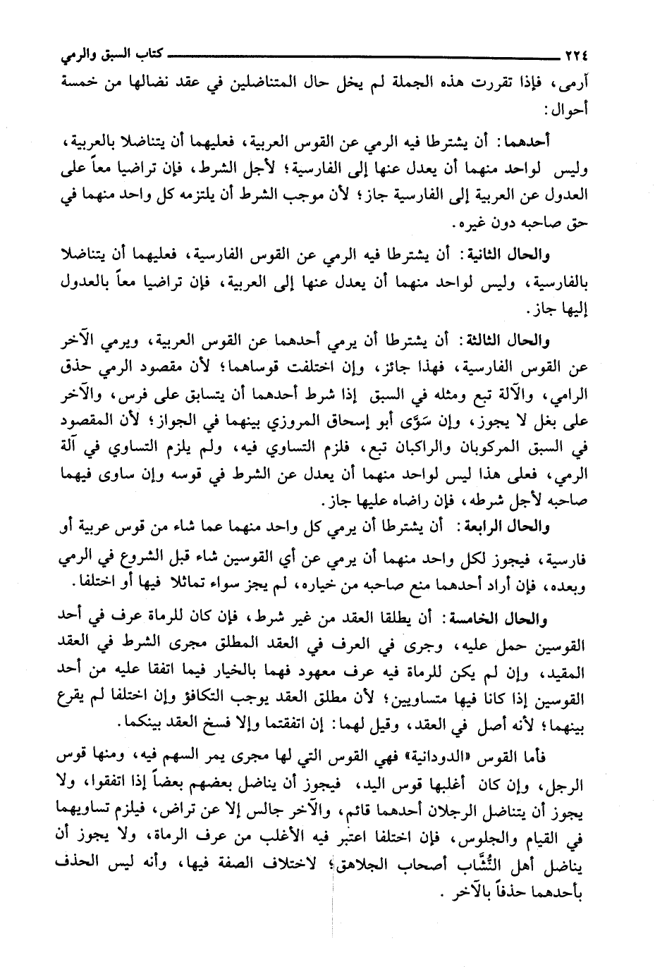 وَالْحَالُ الثَّانِيَةُ: أَنْ يَشْتَرِطَا فِيهِ الرَّمْيَ عَنِ الْقَوْسِ الْفَارِسِيَّةِ، فَعَلَيْهِمَا أَنْ يَتَنَاضَلَا بِالْفَارِسِيَّةِ، وَلَيْسَ لِوَاحِدٍ مِنْهُمَا أَنْ يَعْدِلَ عَنْهَا إِلَى الْعَرَبِيَّةِ، فَإِنْ تَرَاضَيَا مَعًا بِالْعُدُولِ إِلَيْهَا جَازَ.