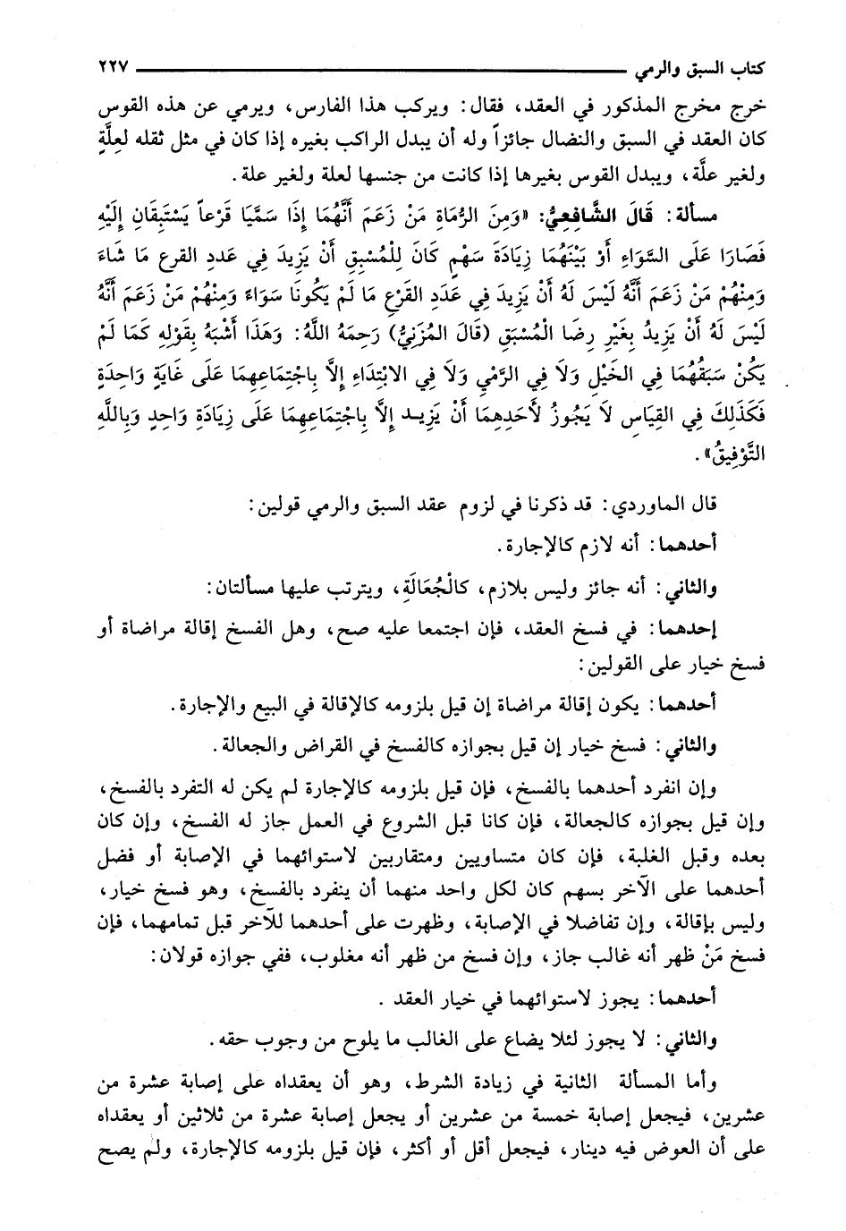 قَالَ الْمَاوَرْدِيُّ: قَدْ ذَكَرْنَا فِي لُزُومِ عَقْدِ السَّبَقِ وَالرَّمْيِ قَوْلَيْنِ: