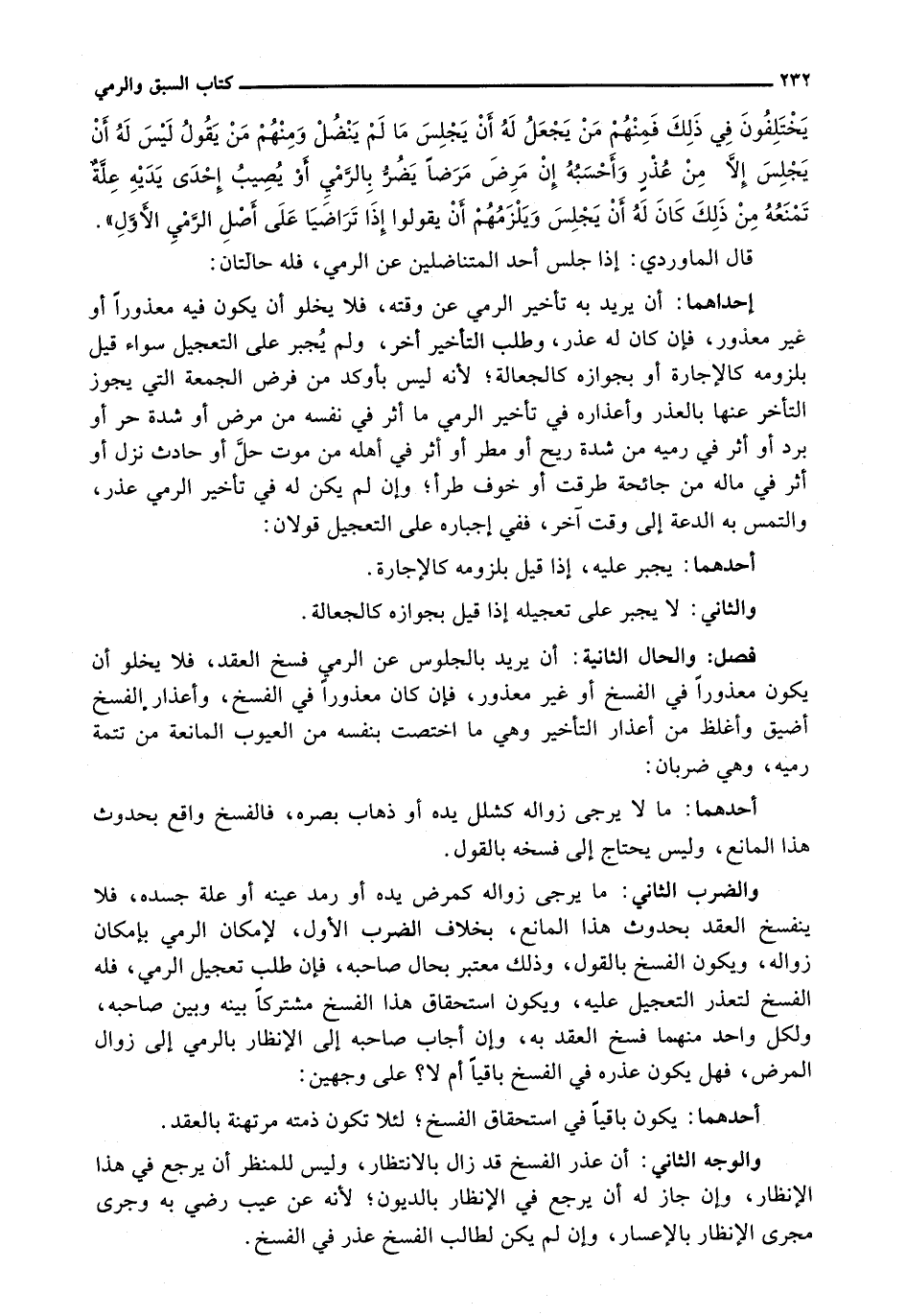 وَالضَّرْبُ الثَّانِي: مَا يُرْجَى زَوَالُهُ كَمَرَضِ يَدِهِ أَوْ رَمَدِ عَيْنِهِ أَوْ علة جسده، فلا يتفسخ الْعَقْدُ بِحُدُوثِ هَذَا الْمَانِعِ، بِخِلَافِ الضَّرْبِ الْأَوَّلِ، لِإِمْكَانِ الرَّمْيِ بِإِمْكَانِ زَوَالِهِ، وَيَكُونُ الْفَسْخُ بِالْقَوْلِ، وَذَلِكَ مُعْتَبَرٌ بِحَالِ صَاحِبِهِ، فَإِنْ طَلَبَ تَعْجِيلَ الرَّمْيِ، فَلَهُ الْفَسْخُ لِتَعَذُّرِ التَّعْجِيلِ عَلَيْهِ، وَيَكُونُ اسْتِحْقَاقُ هَذَا الْفَسْخِ مُشْتَرَكًا بَيْنَهُ وَبَيْنَ صَاحِبِهِ، وَلِكُلِّ وَاحِدٍ مِنْهُمَا فَسْخُ الْعَقْدِ بِهِ، وَإِنْ أَجَابَ صَاحِبَهُ إِلَى الْإِنْظَارِ بِالرَّمْيِ إِلَى زَوَالِ الْمَرَضِ، فَهَلْ يَكُونُ عُذْرُهُ فِي الْفَسْخِ بَاقِيًا أَمْ لَا؟ عَلَى وَجْهَيْنِ:
