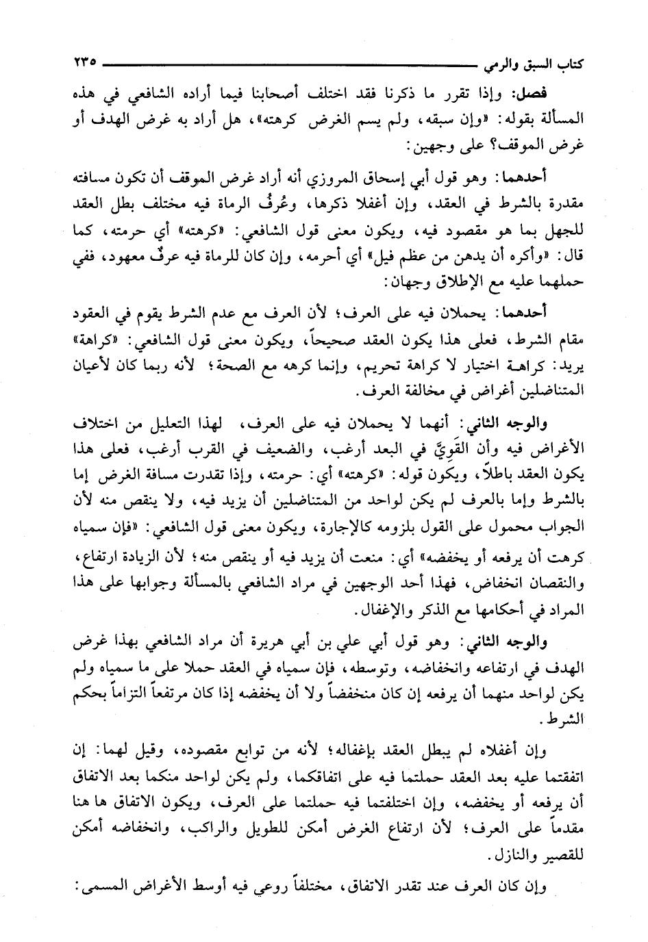 وَالْوَجْهُ الثَّانِي: إِنَّهُمَا لَا يُحْمَلَانِ فِيهِ عَلَى الْعُرْفِ، لِهَذَا التَّعْلِيلِ مِنَ اخْتِلَافِ الْأَغْرَاضِ فِيهِ وَأَنَّ الْقَوِيَّ فِي الْبُعْدِ أَرْغَبُ، وَالضَّعِيفَ فِي الْقُرْبِ أَرْغَبُ، فَعَلَى هَذَا يَكُونُ الْعَقْدُ بَاطِلًا، وَيَكُونُ قَوْلُهُ: " كَرِهْتُهُ " أَيْ: حَرَّمْتُهُ، وَإِذَا تَقَدَّرَتْ مَسَافَةُ الْغَرَضِ إِمَّا بِالشَّرْطِ وَإِمَّا بِالْعُرْفِ لَمْ يَكُنْ لِوَاحِدٍ مِنَ الْمُتَنَاضِلَيْنِ أَنْ يَزِيدَ فِيهِ، وَلَا يَنْقُصَ مِنْهُ لِأَنَّ الْجَوَابَ مَحْمُولٌ عَلَى الْقَوْلِ بِلُزُومِهِ كَالْإِجَارَةِ، وَيَكُونُ مَعْنَى قَوْلِ الشَّافِعِيِّ: " فَإِنْ سَمَّيَاهُ كَرِهْتُ أَنْ يَرْفَعَهُ أَوْ يَخَفِضَهُ " أَيْ: مَنَعْتُ أَنْ يَزِيدَ فِيهِ أَوْ يَنْقُصَ مِنْهُ؛ لِأَنَّ الزِّيَادَةَ ارْتِفَاعٌ، وَالنُّقْصَانَ انْخِفَاضٌ، فَهَذَا أَحَدُ الْوَجْهَيْنِ فِي مُرَادِ الشَّافِعِيِّ بِالْمَسْأَلَةِ وَجَوَابُهَا عَلَى هَذَا الْمُرَادِ فِي أَحْكَامِهَا مَعَ الذِّكْرِ وَالْإِغْفَالِ.