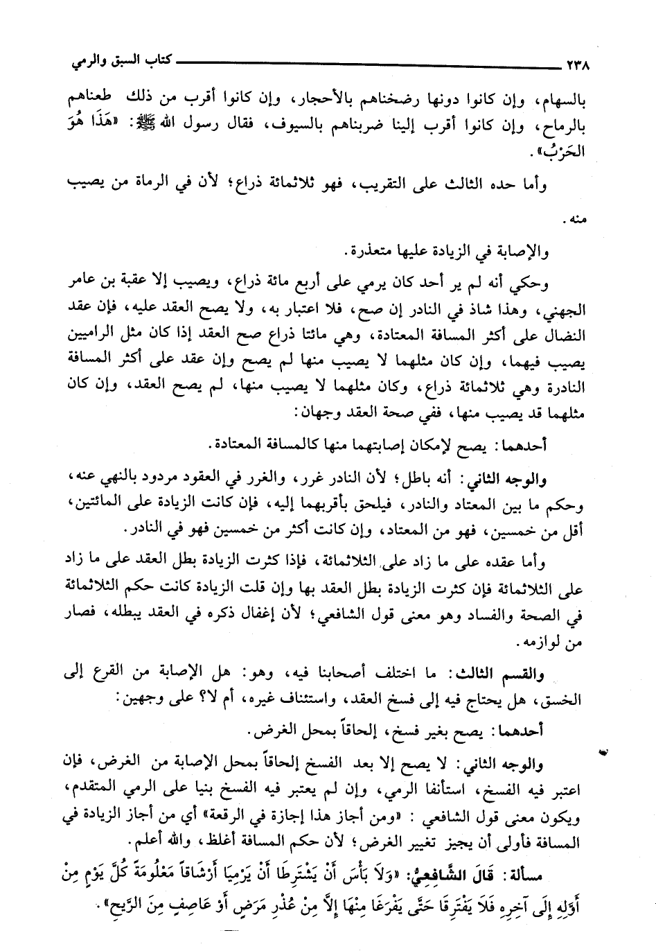 وَحُكِيَ أَنَّهُ لَمْ يُرَ أَحَدٌ كَانَ يَرْمِي عَلَى أَرْبَعِ مائة ذراع، ويصيب إلا عقبة من عَامِرٍ الْجُهَنِيُّ، وَهَذَا شَاذٌّ فِي النَّادِرِ إِنْ صَحَّ، فَلَا اعْتِبَارَ بِهِ، وَلَا يَصِحُّ الْعَقْدُ عليه، فإن عقد النضال على أكثر الْمَسَافَةِ الْمُعْتَادَةِ، وَهِيَ مِائَتَا ذِرَاعٍ صَحَّ الْعَقْدُ إِذَا كَانَ مِثْلُ الرَّامِيَيْنِ يُصِيبُ فِيهِمَا، وَإِنْ كَانَ مِثْلُهُمَا لَا يُصِيبُ مِنْهَا لَمْ يَصِحَّ وَإِنْ عُقِدَ عَلَى أَكْثَرَ الْمَسَافَةِ النَّادِرَةِ وَهِيَ ثَلَاثُمِائَةِ ذِرَاعٍ، وَكَانَ مِثْلُهُمَا لَا يُصِيبُ مِنْهَا، لَمْ يَصِحَّ الْعَقْدُ، وَإِنْ كَانَ مِثْلُهُمَا قَدْ يُصِيبُ مِنْهَا، فَفِي صِحَّةِ الْعَقْدِ وَجْهَانِ: