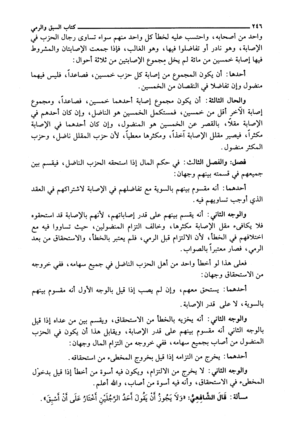 والحال الثالثة: أَنْ يَكُونَ مَجْمُوعُ إِصَابَةِ أَحَدِهِمَا خَمْسِينَ، فَصَاعِدًا، وَمَجْمُوعُ إِصَابَةِ الْآخَرِ أَقَلُّ مِنْ خَمْسِينَ، فَمُسْتَكْمِلُ الْخَمْسِينَ هُوَ النَّاضِلُ، وَإِنْ كَانَ أَحَدُهُمْ فِي الْإِصَابَةِ مُقِلًّا، بِالْقَصْرِ عَنِ الْخَمْسِينَ هُوَ الْمَنْضُولُ، وَإِنْ كَانَ أَحَدُهُمَا فِي الْإِصَابَةِ مُكْثِرًا، فَيَصِيرُ مُقَلِّلُ الْإِصَابَةِ آخِذًا، وَمُكْثِرُهَا مُعْطِيًا، لِأَنَّ حِزْبَ الْمُقَلِّلِ نَاضِلٌ، وَحِزْبَ الْمُكْثِرِ مَنْضُولٌ.