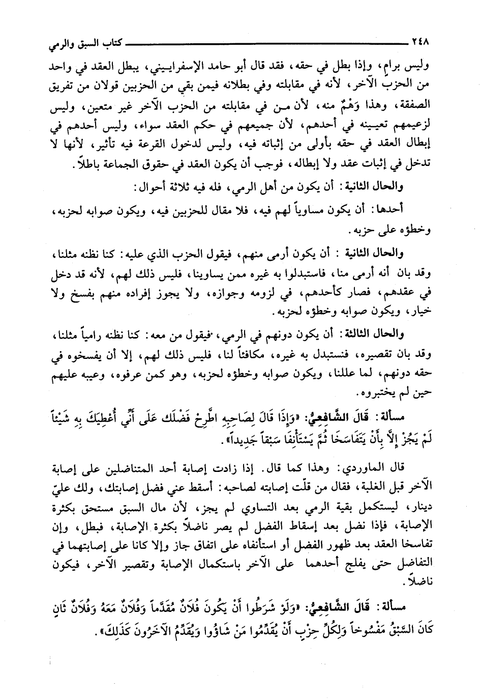 وَلَيْسَ برامٍ، وَإِذَا بَطَلَ فِي حَقِّهِ، فَقَدْ قَالَ أَبُو حَامِدٍ الْإِسْفَرَايِينِيُّ، يَبْطُلُ الْعَقْدُ فِي واحد من الحزب لآخر، لِأَنَّهُ فِي مُقَابَلَتِهِ وَفِي بُطْلَانِهِ فِيمَنْ بَقِيَ مِنَ الْحِزْبَيْنِ قَوْلَانِ مِنْ تَفْرِيقِ الصَّفْقَةِ، وَهَذَا وهمٌ مِنْهُ، لِأَنَّ مَنْ فِي مُقَابَلَتِهِ مِنَ الْحَزْبِ الْآخَرِ غَيْرُ مُتَعَيِّنٍ، وَلَيْسَ لِزَعِيمِهِمْ تَعْيِينُهُ فِي أَحَدِهِمْ، لِأَنَّ جَمِيعَهُمْ فِي حُكْمِ الْعَقْدِ سَوَاءٌ، وَلَيْسَ أَحَدُهُمْ فِي إِبْطَالِ الْعَقْدِ فِي حقه بأولى من إثباته فيه، وليس لدخول الْقُرْعَةَ فِيهِ تَأْثِيرٌ، لِأَنَّهَا لَا تَدْخُلُ فِي إِثْبَاتِ عَقْدٍ وَلَا إِبْطَالِهِ، فَوَجَبَ أَنْ يَكُونَ الْعَقْدُ فِي حُقُوقِ الْجَمَاعَةِ بَاطِلًا.
